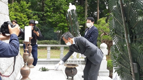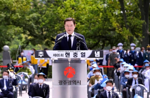 [해륙뉴스1= 광주] 이용섭 광주광역시장이 6일 오전 남구 광주공원 현충탑에서 열린 ‘제65회 현충일 추념식...