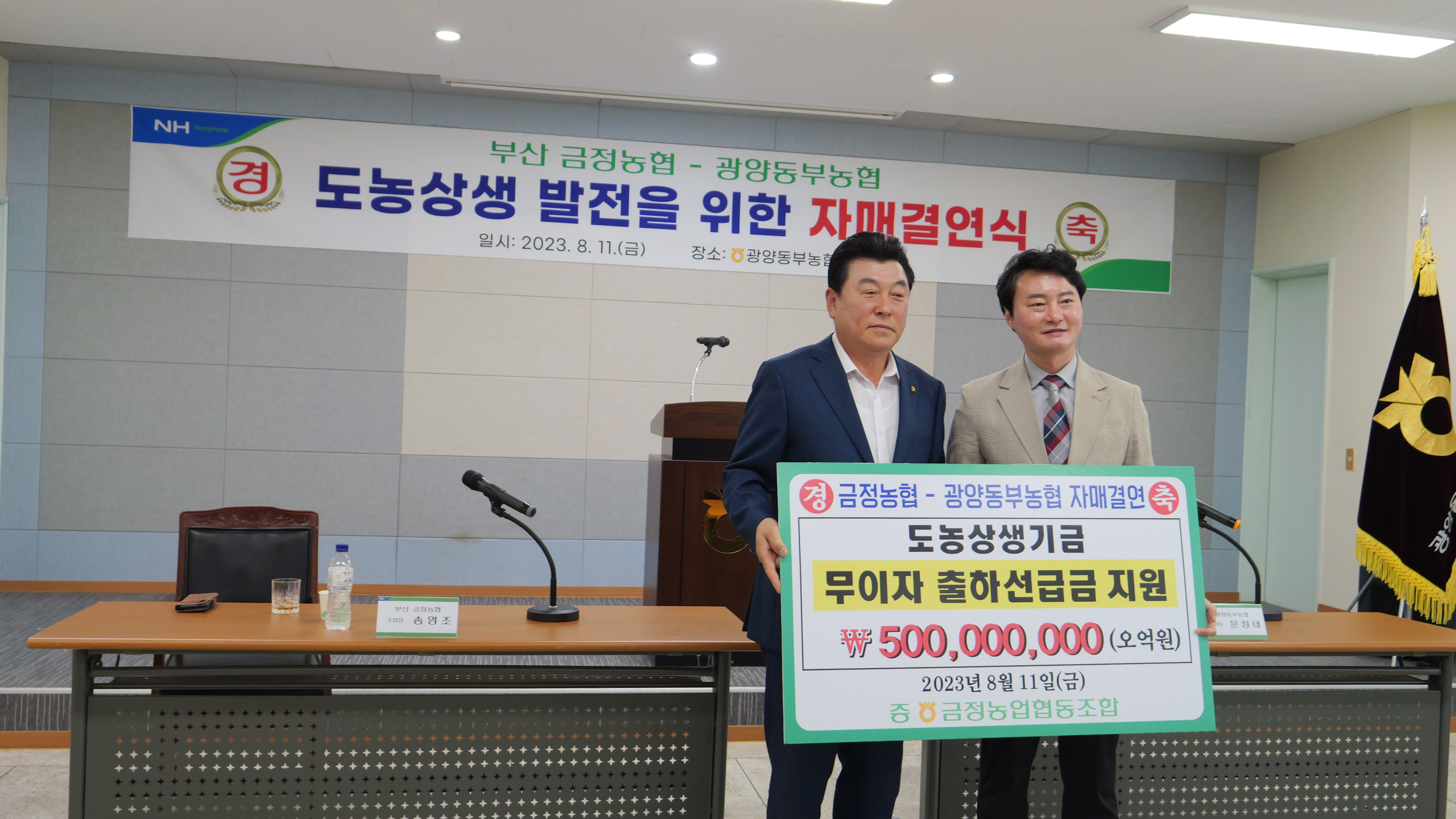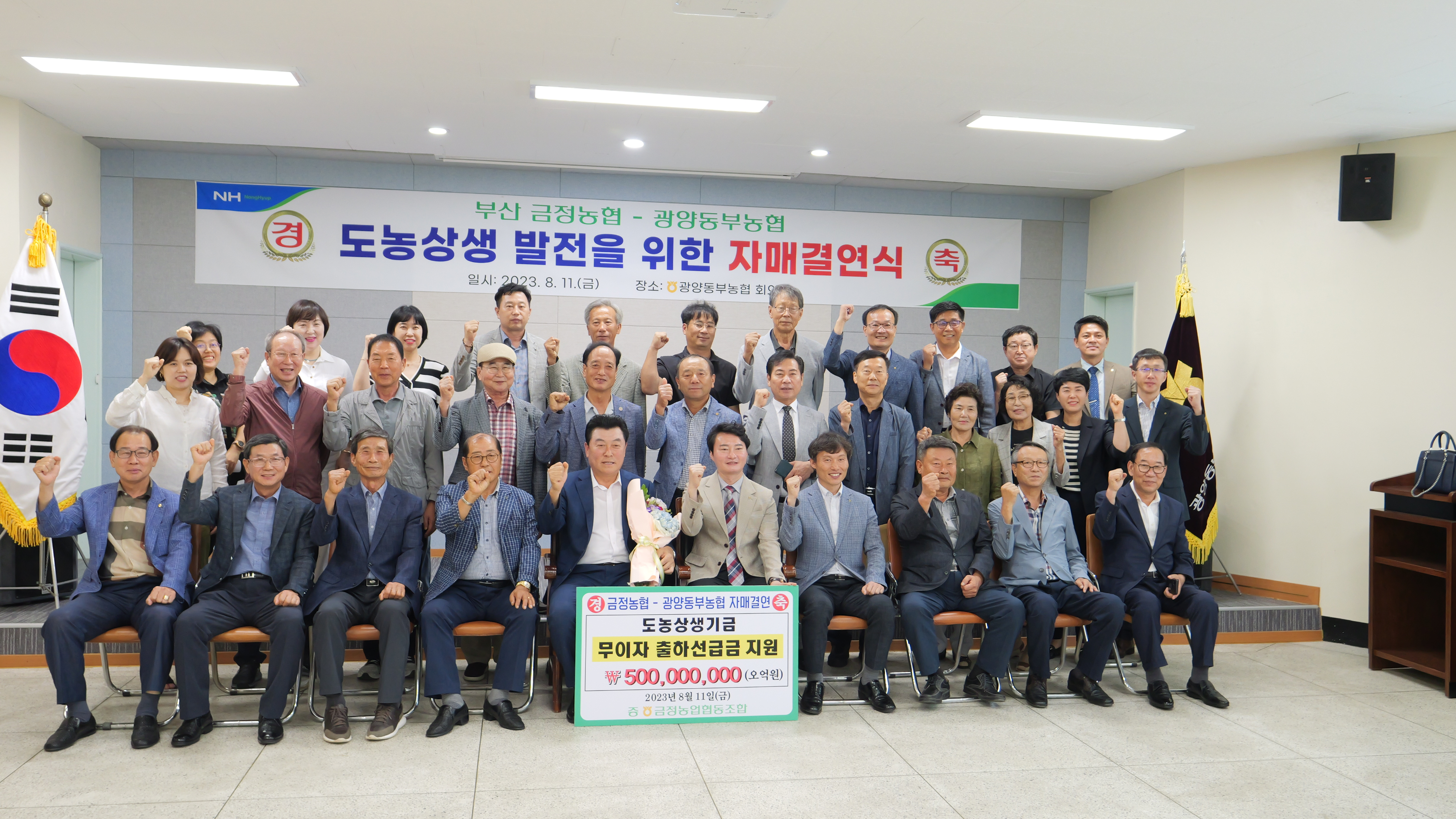 광양동부농협(조합장 문정태)과 부산 금정농협(조합장 송영조)은 금일(8월11일 금요일) 17:00시 광양동부농협 본점 회의실에서 농촌과 도시농협 간 상호협력과 발전을 위한 자매결연 협약식을 하였다.
