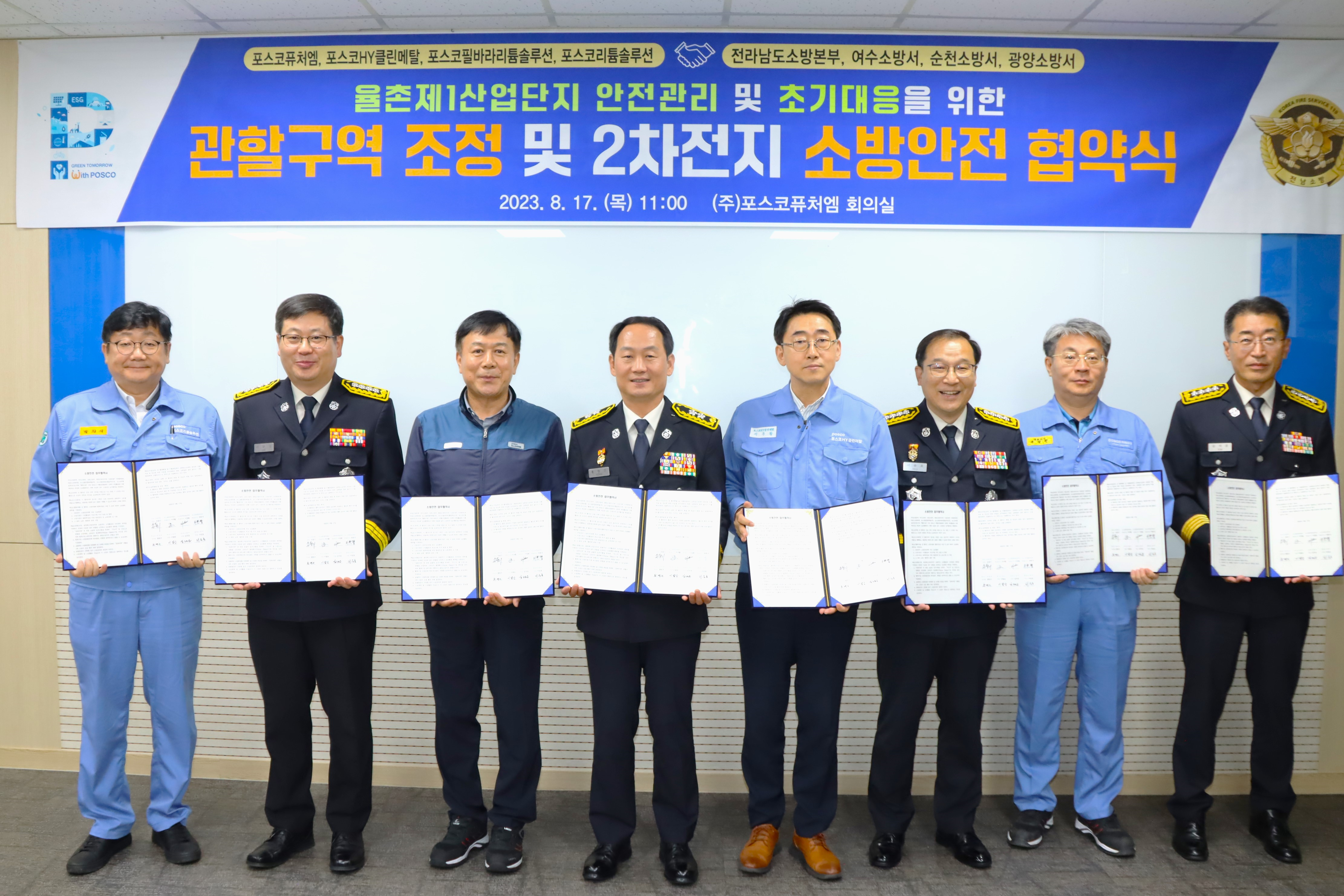 이날 협약식에는 전남소방본부장을 비롯한 3개 시 소방서장(여수·순천·광양)과 율촌제1산업단지 4개 기업체(포스코퓨처엠, 포스코HY클린메탈, 포스코필바라리튬솔루션, 포스코리튬솔루션) 대표가 참석했다.