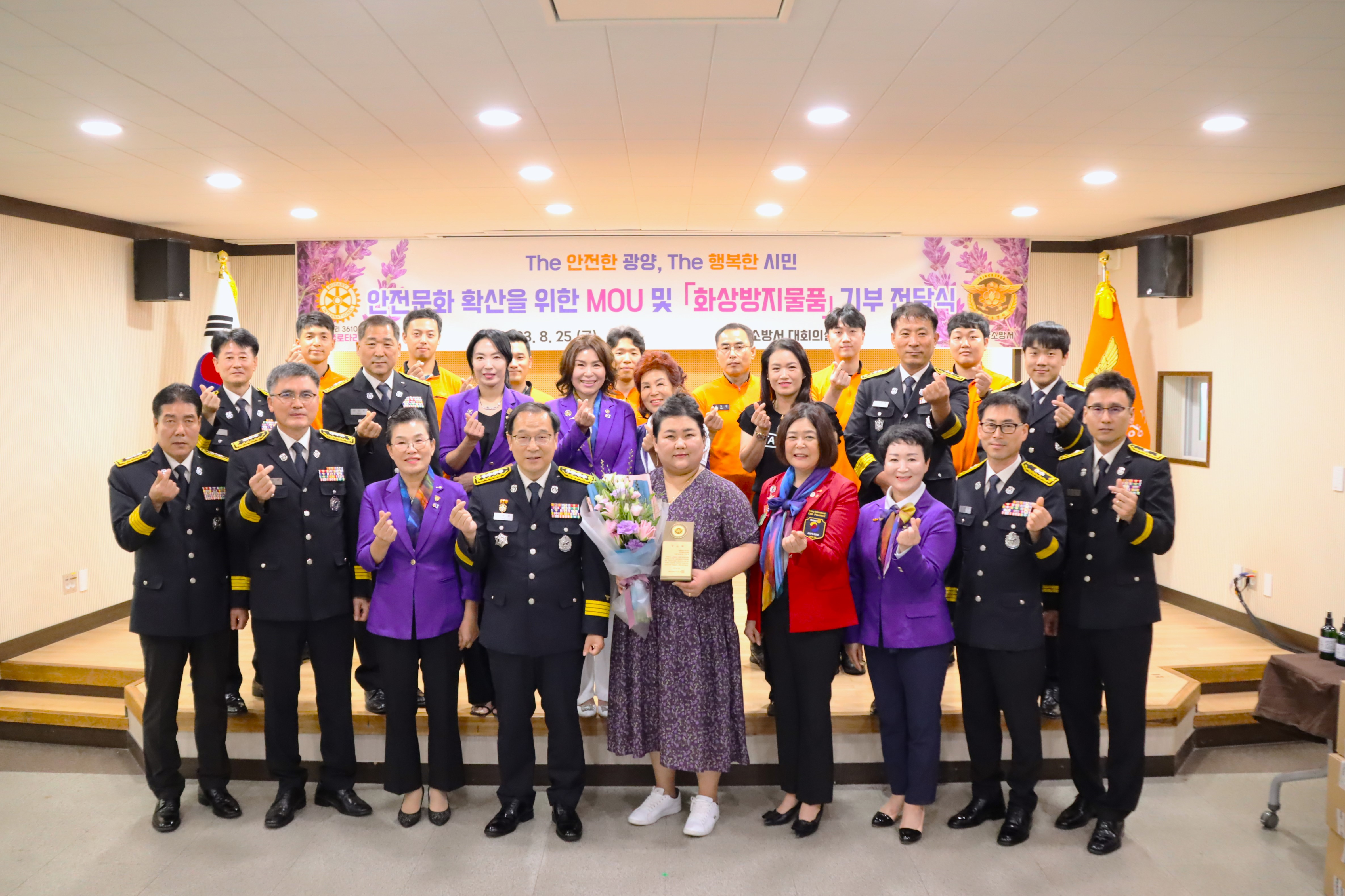 [해륙뉴스1]=서정민기자.광양소방서(서장 서승호)는 국제로타리 3610지구 제5지역 광양퍼플로타리클럽과 소방안전문화 확산 및 지원체계 협력 구축을 위해 업무협약을 체결하고 직원 건강관리를 위한 “화상방지물품(1,800만원 상당)”을 기부받아 전달식을 진행했다고 24일 밝혔다.