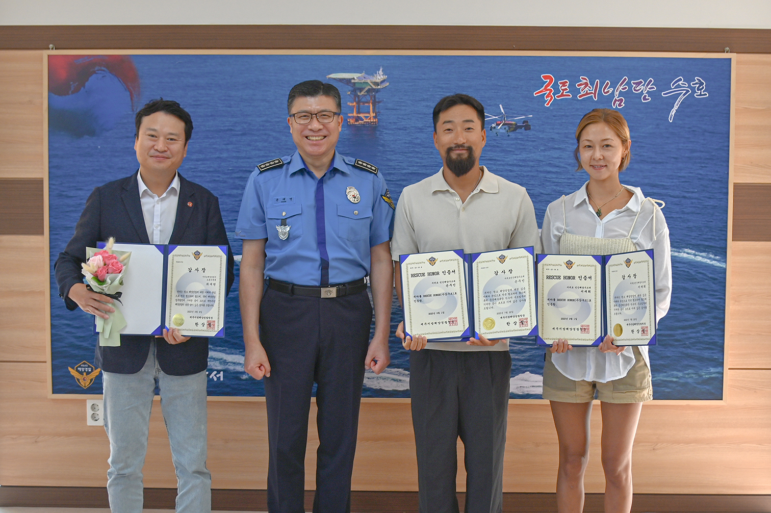 이 날 수여식에서는 해수욕장 인명구조에 눈부신 활약을 한 서프구조대 손주민, 서재희 대원과 해상 실종자 수색에 도움을 준 드론수색대 최재현 대원 등 3명에게 감사장과 함께 레스큐아너* 인증서를 수여하였다.