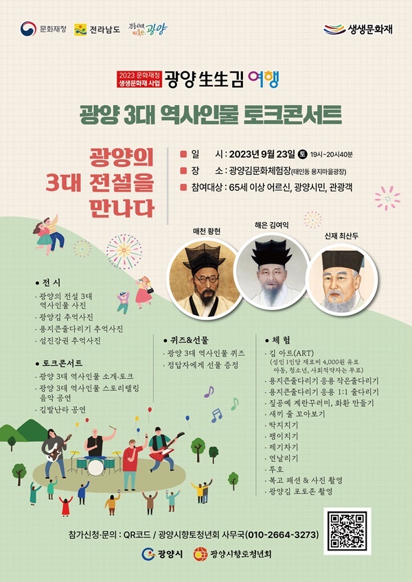 광양시는 오는 9월 23일 오후 7시 태인동 광양김문화체험장에서 광양 3대 역사인물 토크콘서트 ‘광양의 3대 전설을 만나다’를 개최한다.