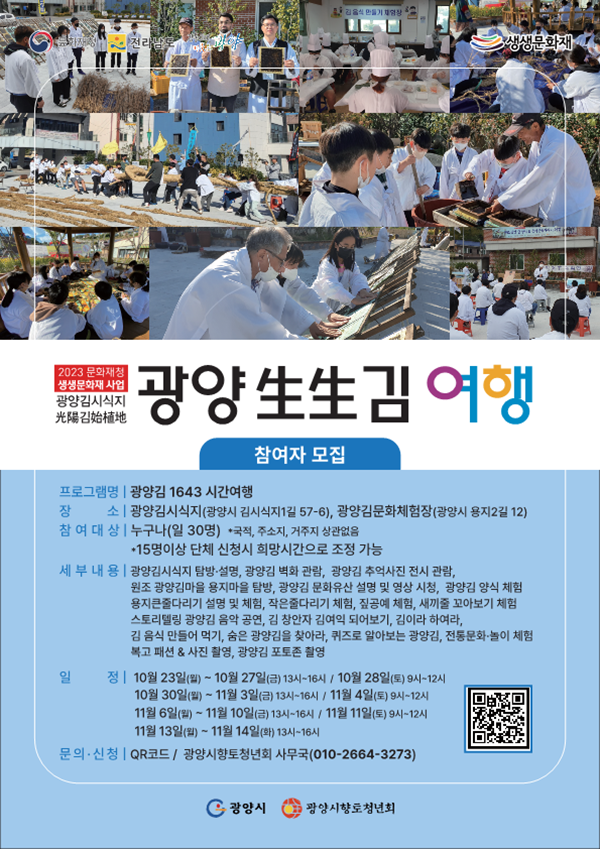 한편, ‘광양김 1643 시간여행’의 참여는 포스터 아래 QR코드 접수와 전화접수로 이뤄지고 자세한 사항은 광양시향토청년회 사무국으로 문의하면 된다.