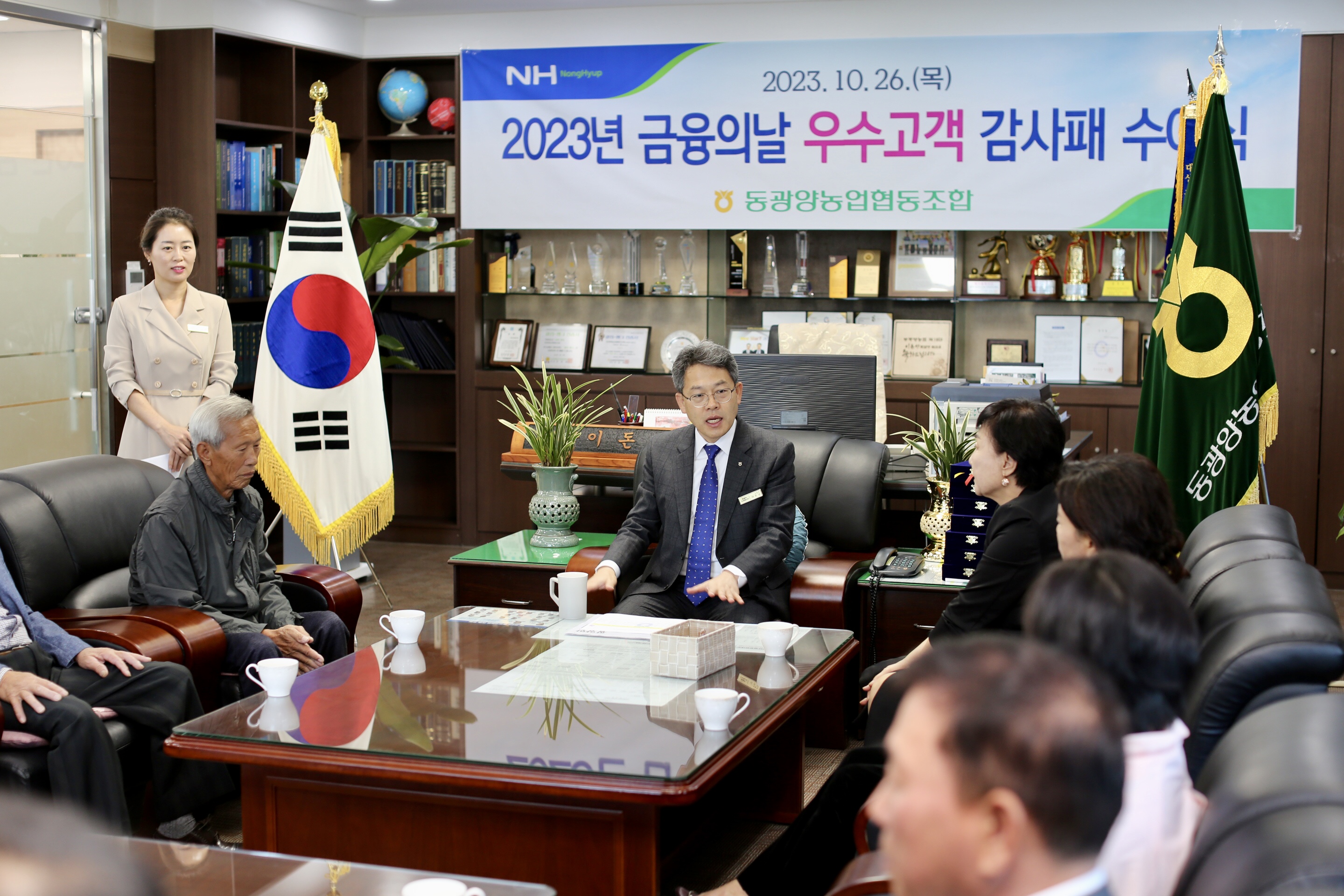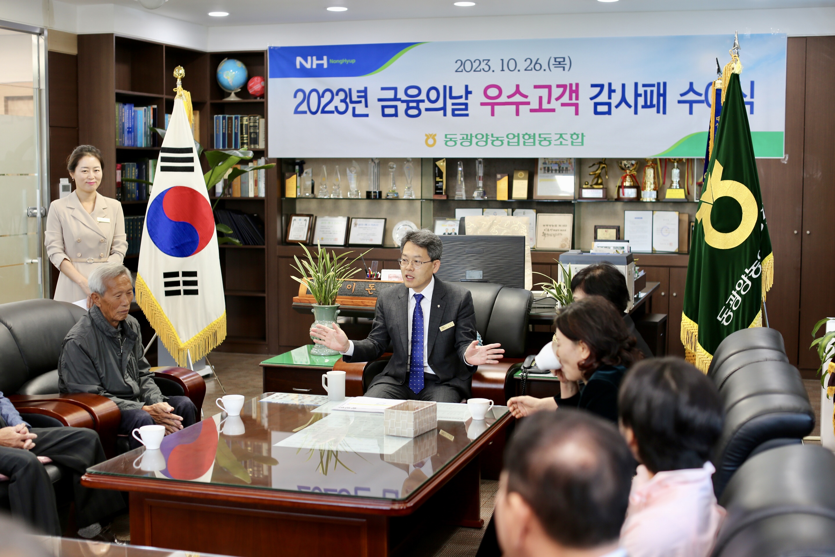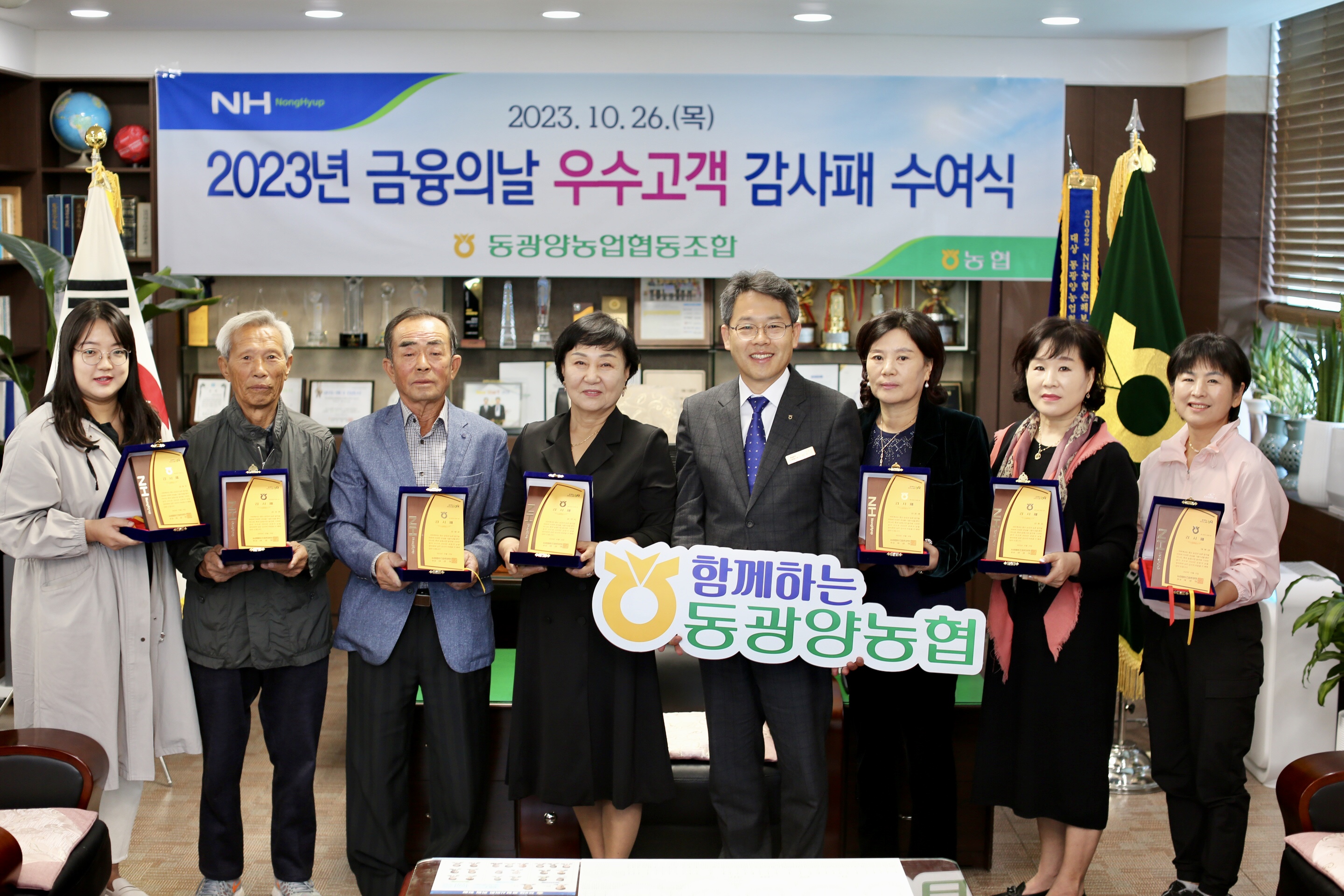 동광양농협(조합장 이돈성)이 26일 본점에서 제8회 금융의 날을 맞아 이성희 농협중앙회장을 대신하여 우수고객 7명에게 감사패를 전달하였다.