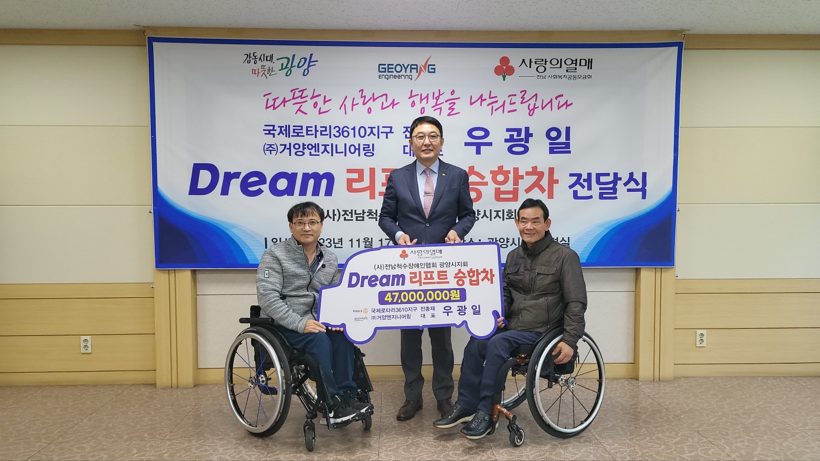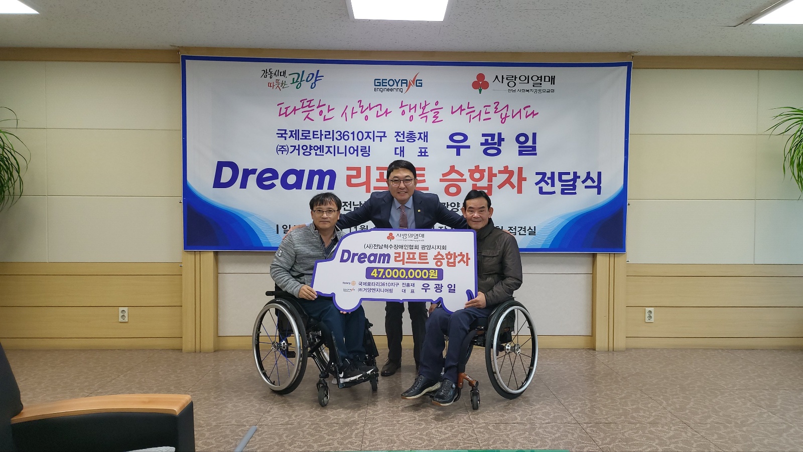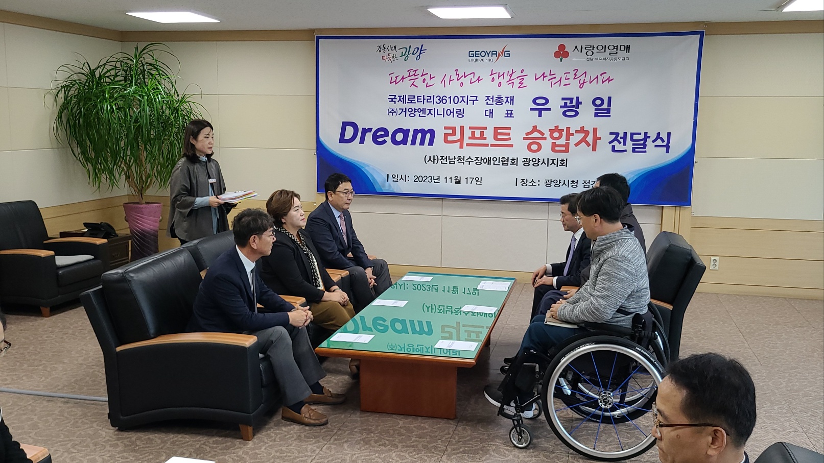 ㈜거양엔지니어링과 (사)척수장애인협회 광양시지회 차량구입비 전달식이 오늘(11월17일) 15:20분 광양시청 2층 접견실에서 있었다.