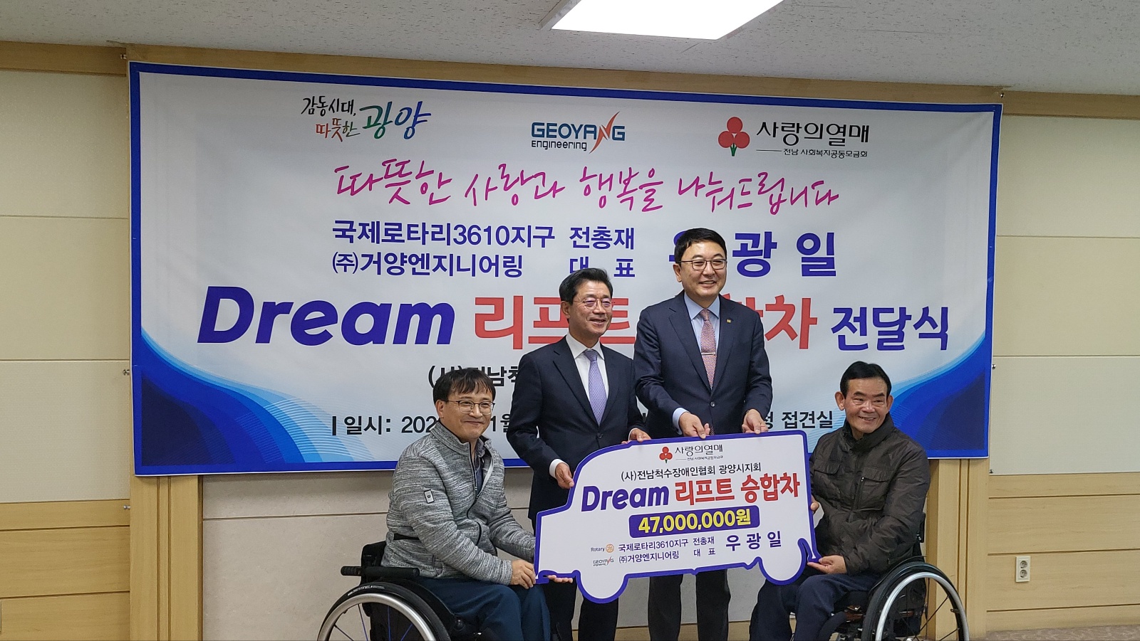 오늘 행사에는 정인화 광양시장과 ㈜거양엔지니어링 우광일 대표 국제로타리클럽 3610 지구 연수위원 천만종, 고현란, (사)척수장애인협회 광양시지회 지회장 직무대행 송규향외 1명 참석했다.