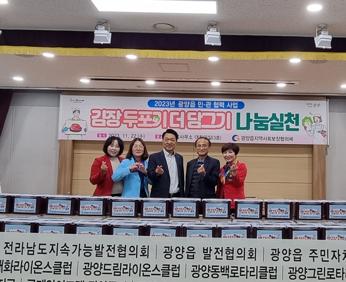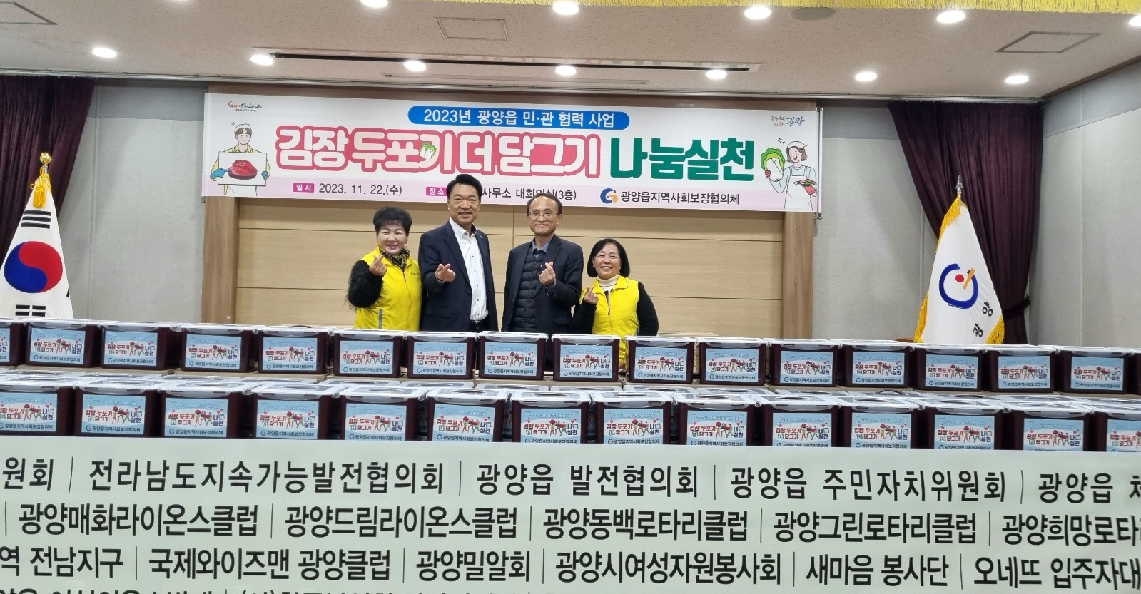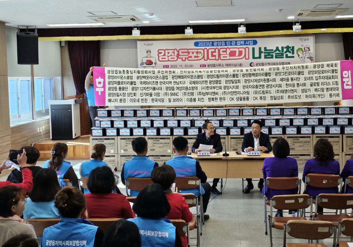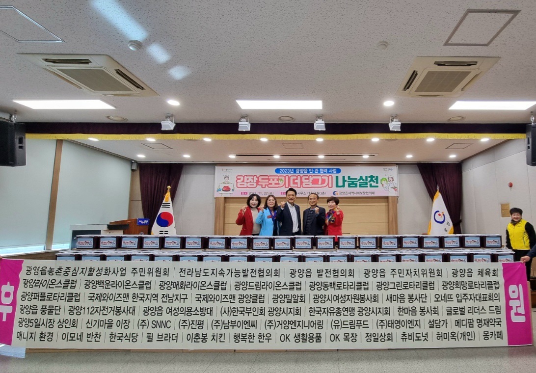 광양시 광양읍지역사회보장협의체(공공위원장 정용균, 민간위원장 허형채)가 지난 22일광양읍 49개 지역사회 단체와 협력해 지역 내 취약계층 637가구에 김장(9L) 637통을 지원하기 위해 읍사무소 대회의실에서 나눔의 실천 자리를 가졌다.