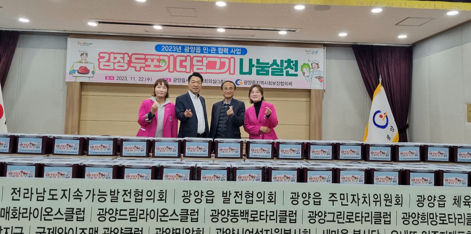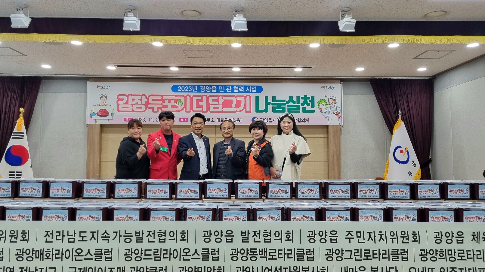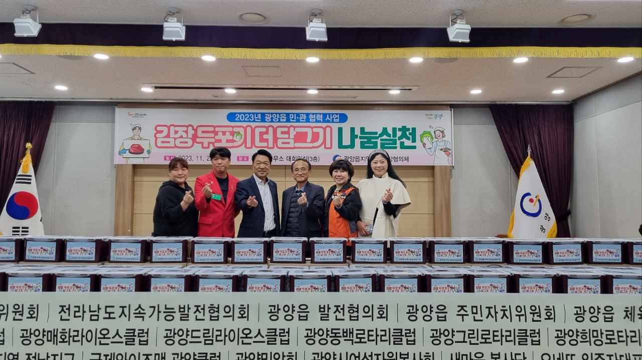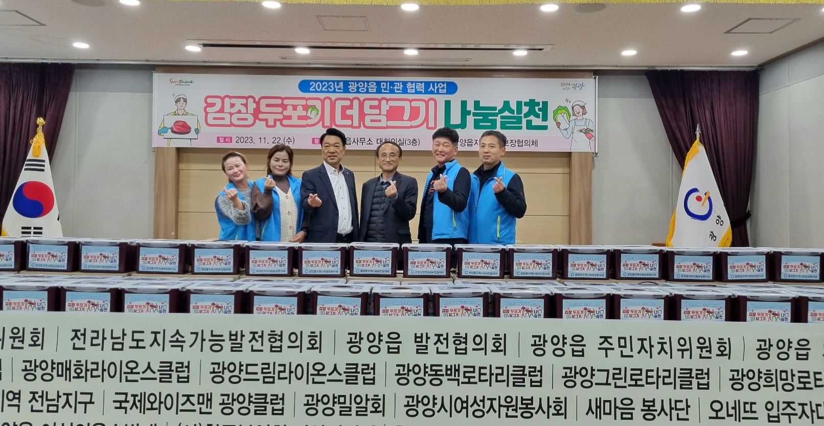 광양시 광양읍지역사회보장협의체(공공위원장 정용균, 민간위원장 허형채)가 지난 22일광양읍 49개 지역사회 단체와 협력해 지역 내 취약계층 637가구에 김장(9L) 637통을 지원하기 위해 읍사무소 대회의실에서 나눔의 실천 자리를 가졌다.