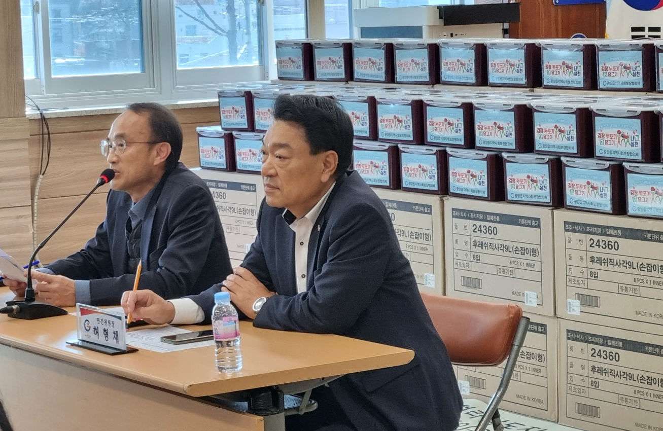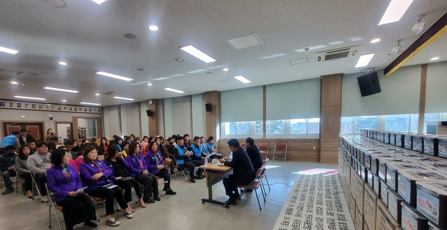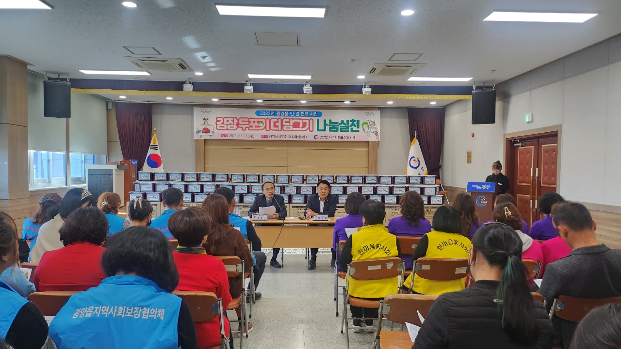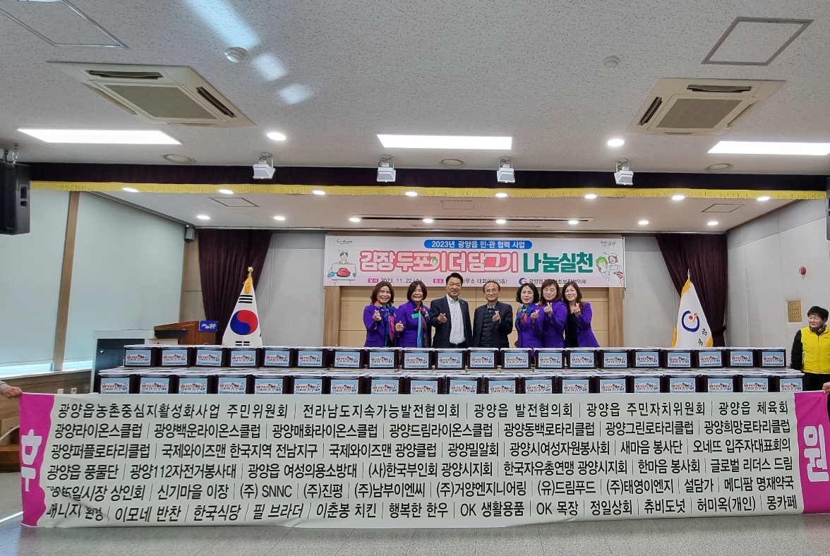 광양시 광양읍지역사회보장협의체(공공위원장 정용균, 민간위원장 허형채)가 지난 22일광양읍 49개 지역사회 단체와 협력해 지역 내 취약계층 637가구에 김장(9L) 637통을 지원하기 위해 읍사무소 대회의실에서 나눔의 실천 자리를 가졌다.