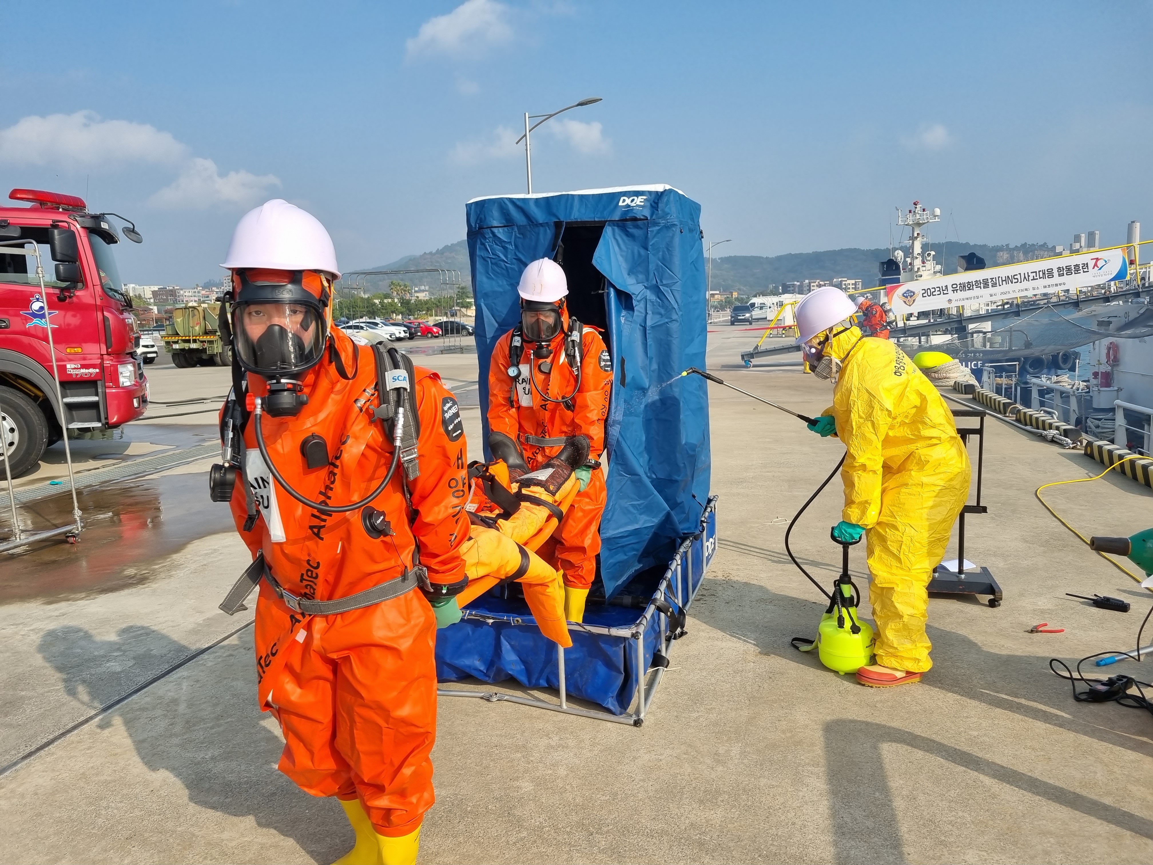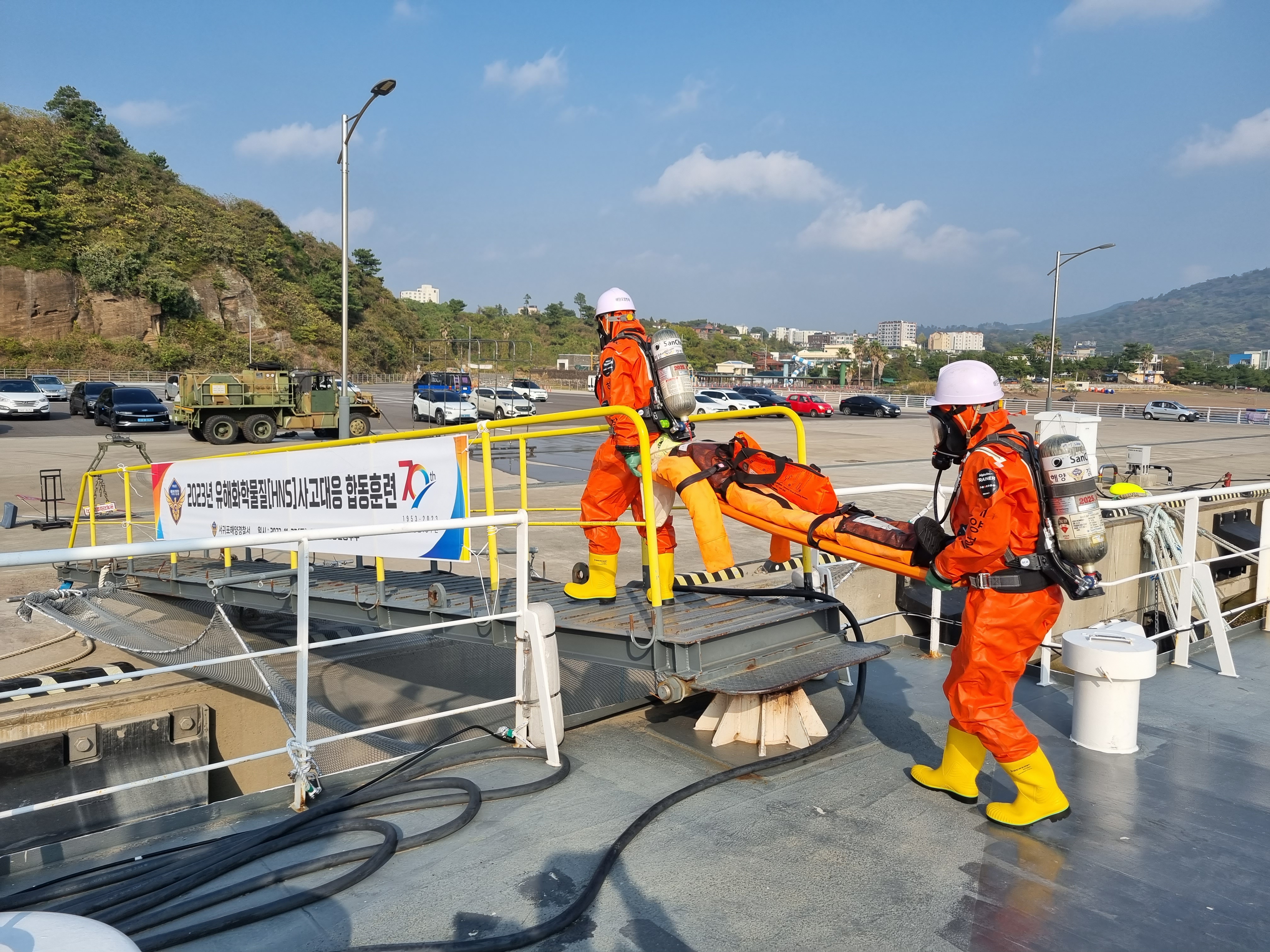 서귀포해양경찰(서장 윤태연)는 어제(23일) 오후 2시 서귀포시 안덕면 화순항 일대에서 유해화학물질 유출사고에 대비하여 ‘2023년 유해화학물질 사고대응 합동훈련’을 실시했다고 밝혔다.