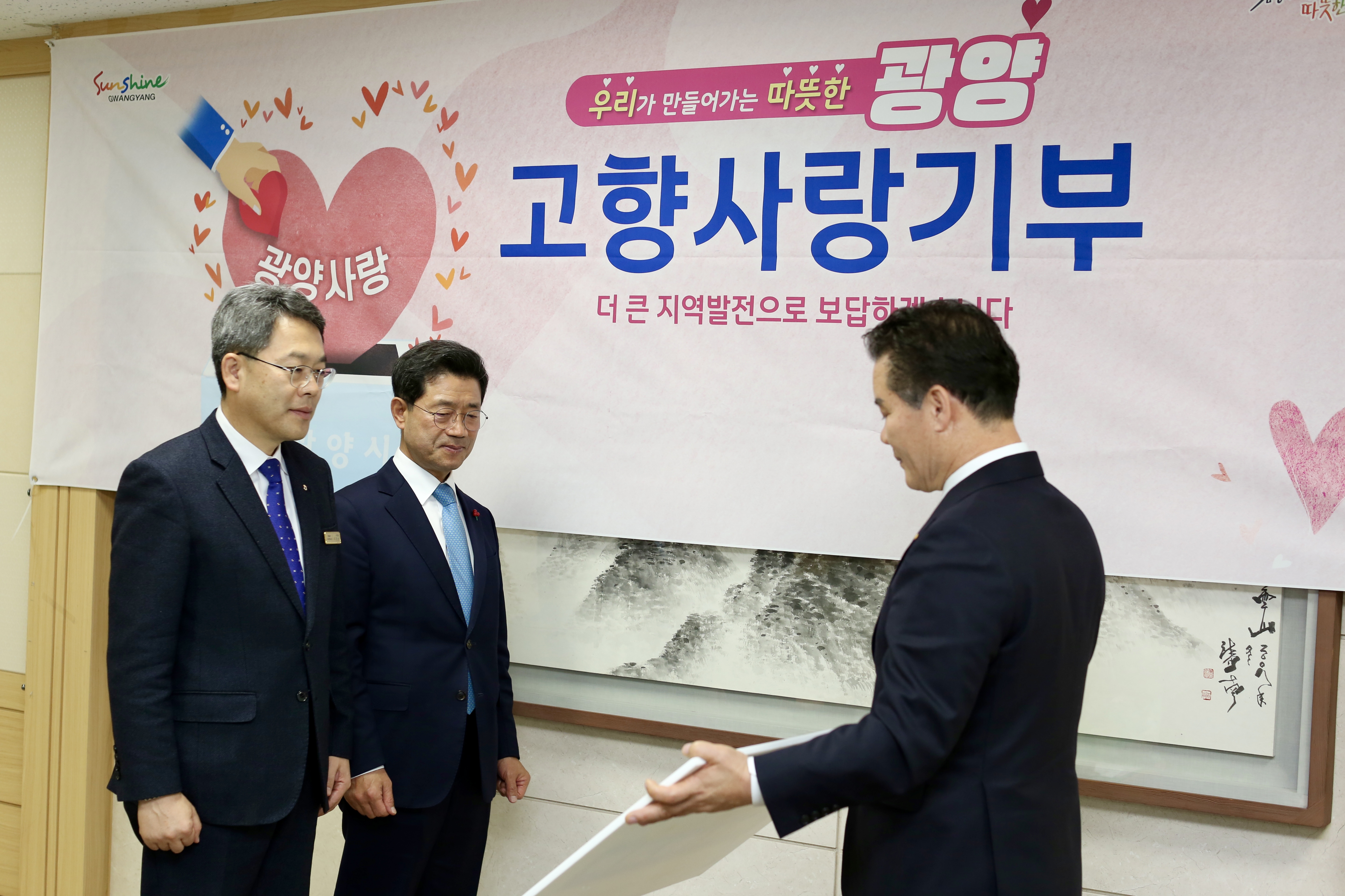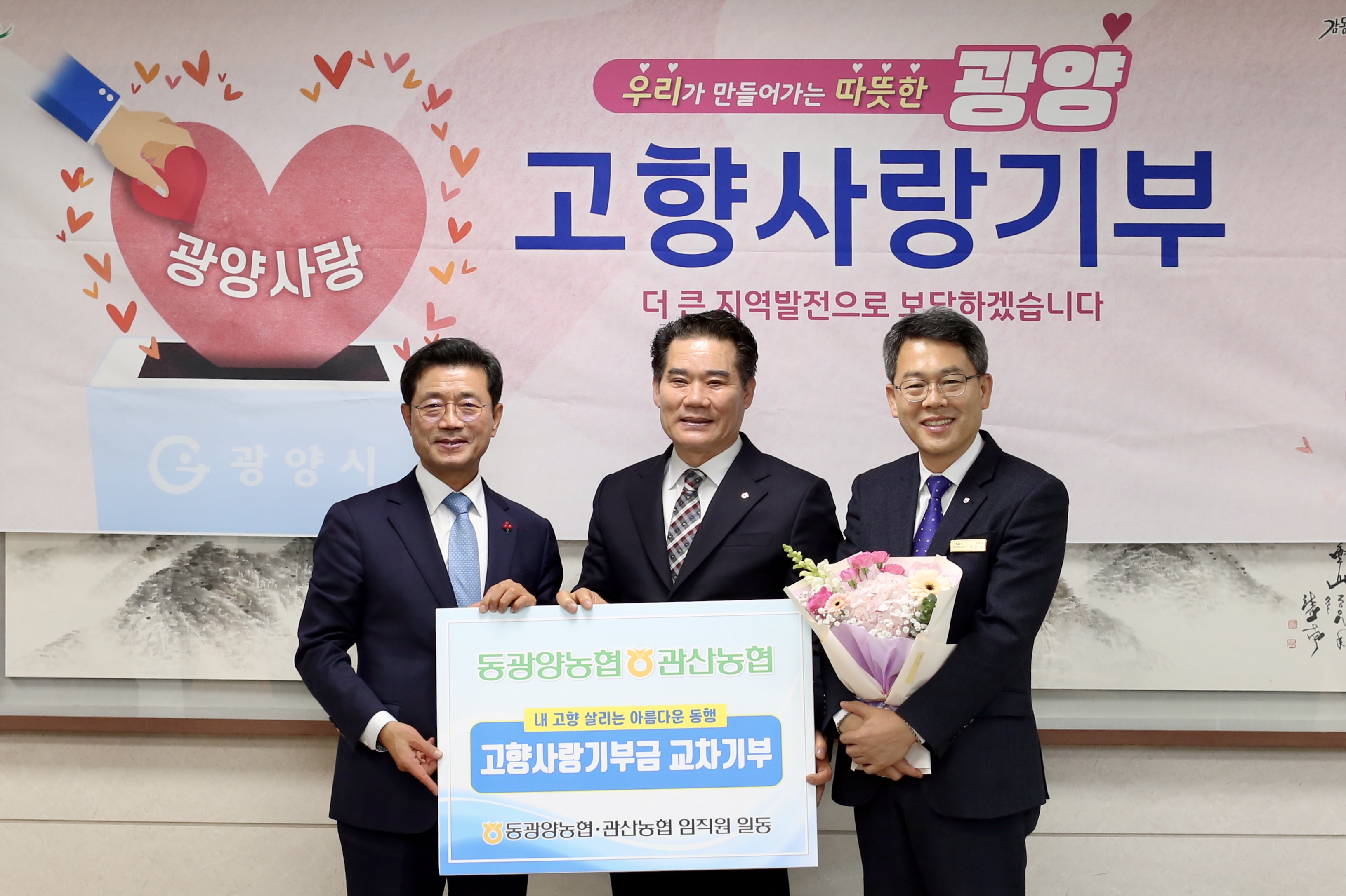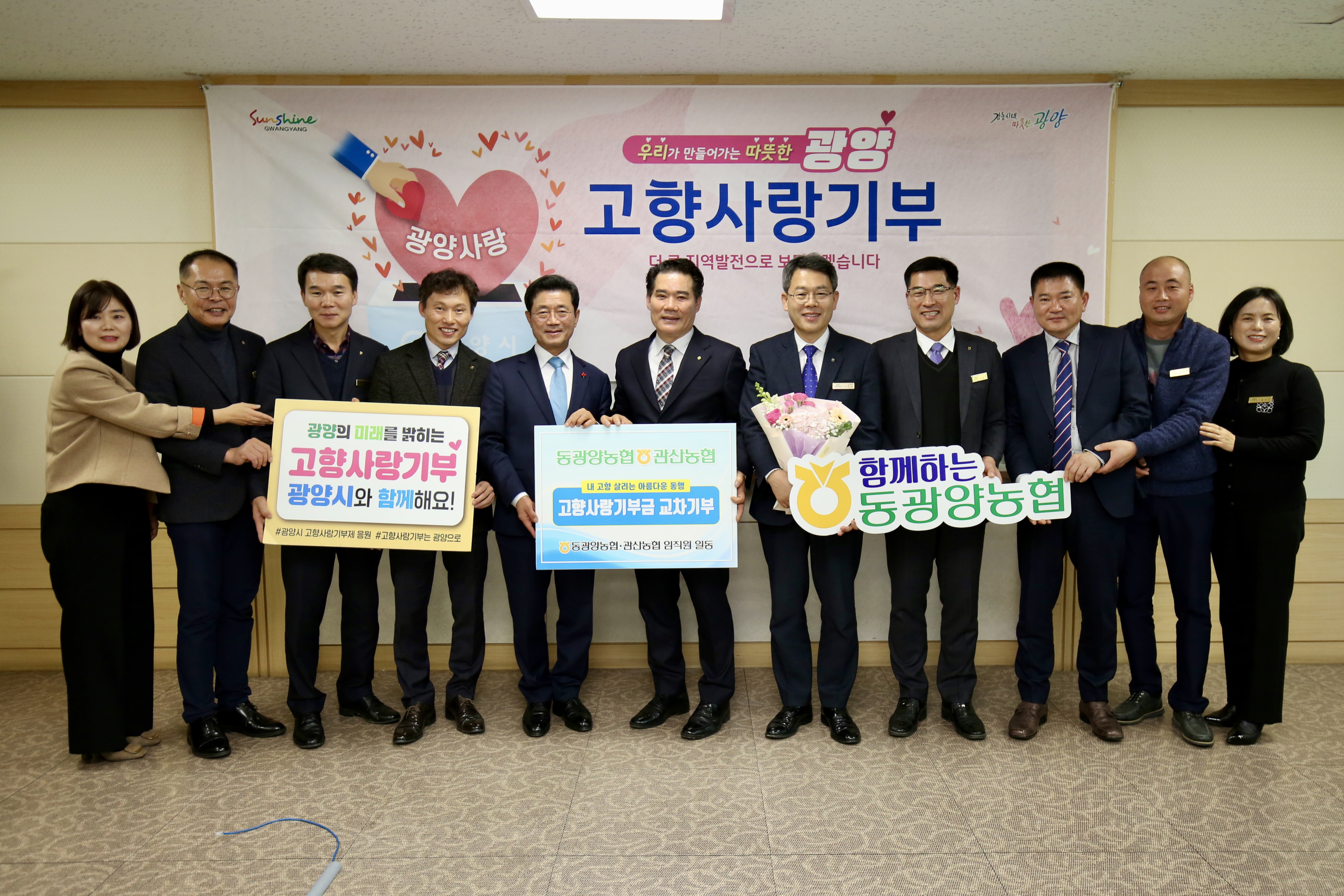 동광양농협(조합장 이돈성)과 관산농협(조합장 오형주)이 지난 12일 광양시청(시장 정인화)에서 고향사랑기부금 교차 기부식을 열었다.