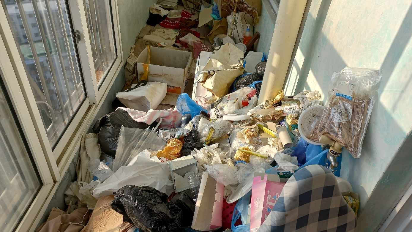 초기에 외부와 벽을 쌓고 방문을 거부하던 대상자는 직원들의 20여 차례 지속적인 방문으로 면담을 하였으나 정상적인 대화가 불가능하였고, 집안 내부는 악취와 잡동산 물건을 가득 쌓아둔 채로 통행이 어려울 정도로 적치 되어있는 환경에서 살고 있는 대상가구를 두고 볼 수 없어 설득과 감성으로 소통하여 정리정돈만 하는 걸로 어렵게 허락을 받고 다가갔다.