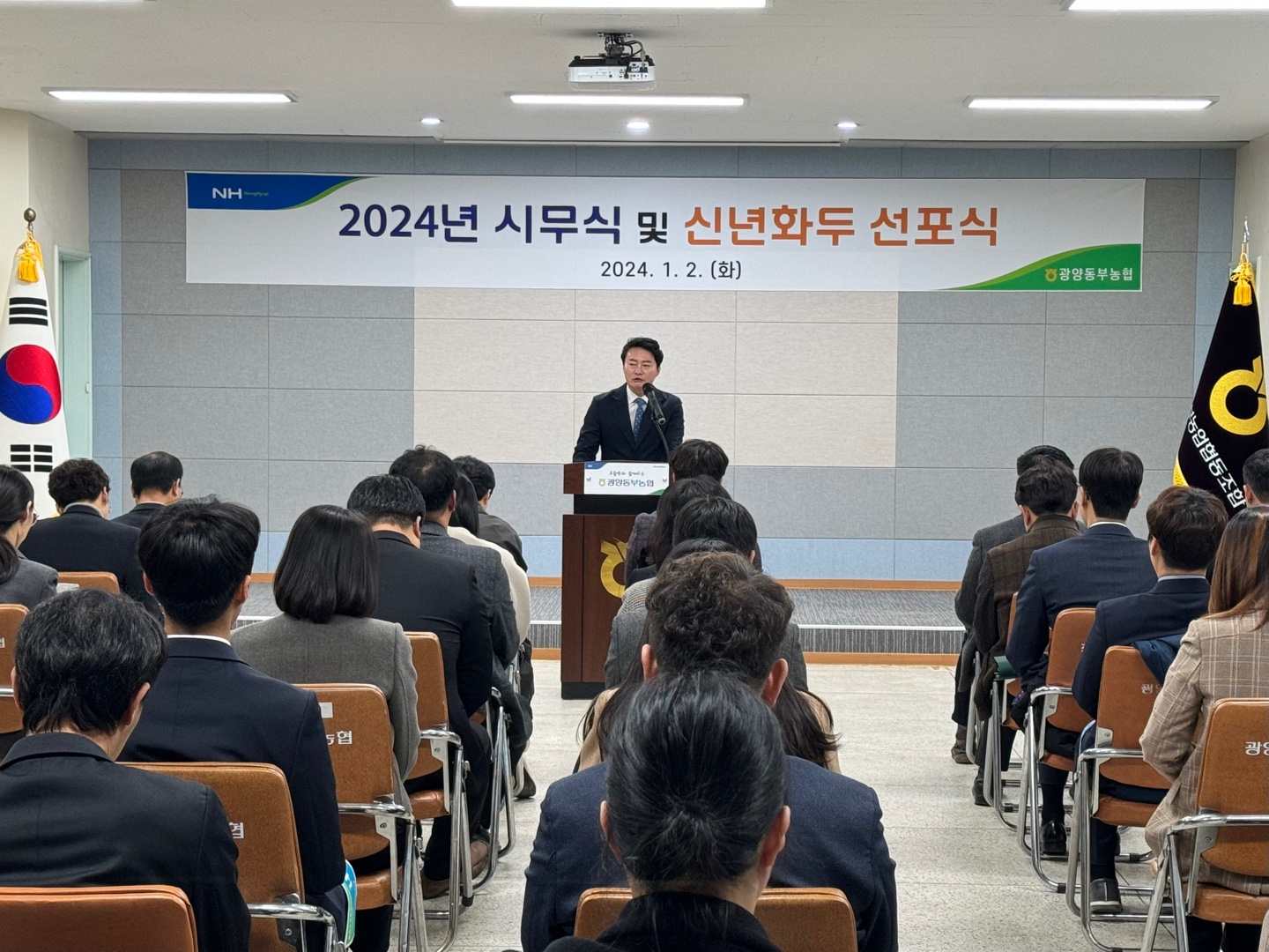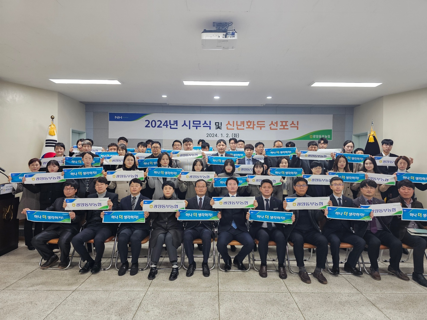 광양동부농협(조합장 문정태)은 새해 첫 영업일인 지난 1월2일 본점 회의실에서 전체직원이 모인 가운데 시무식을 가졌다. 이날 시무식에서는 2024년 신년화두를 ‘하나 더 생각하자’로 선정해 신년화두 선포식도 함께 진행됐다.