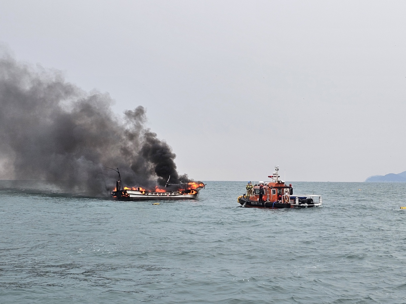 화재 어선 A호는 선체 전체로 화재가 확산하여 경비함정이 화재를 진압 중에 있다.