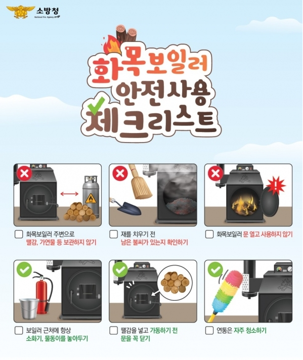 주요 안전 수칙은 ▲보일러 주변에 땔감, 가연물 등 보관하지 않기 ▲잔재 제거 전 남은 불씨 여부 확인 ▲보일러 주변에 소화기, 물동이 비치 ▲주기적으로 연통 청소하기 등이다.