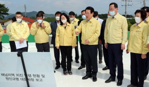사진 설명 김영록 전남도지사는 21일 최근 70여 차례의 지진이 발생한 해남 산이면 지역을 방문해 지진 발생...