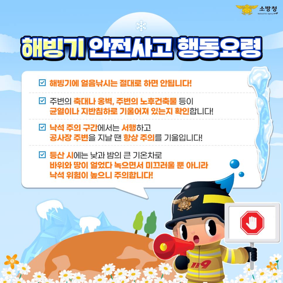 해빙기 안전사고 예방을 위해 △얼음 위 놀이ㆍ낚시 금지 △건축물 주변 옹벽ㆍ축대 균열 확인 △낙석 발생 위험지역 주의 △등산 시 미끄럼 사고 주의 등 안전 수칙을 준수해야 한다.