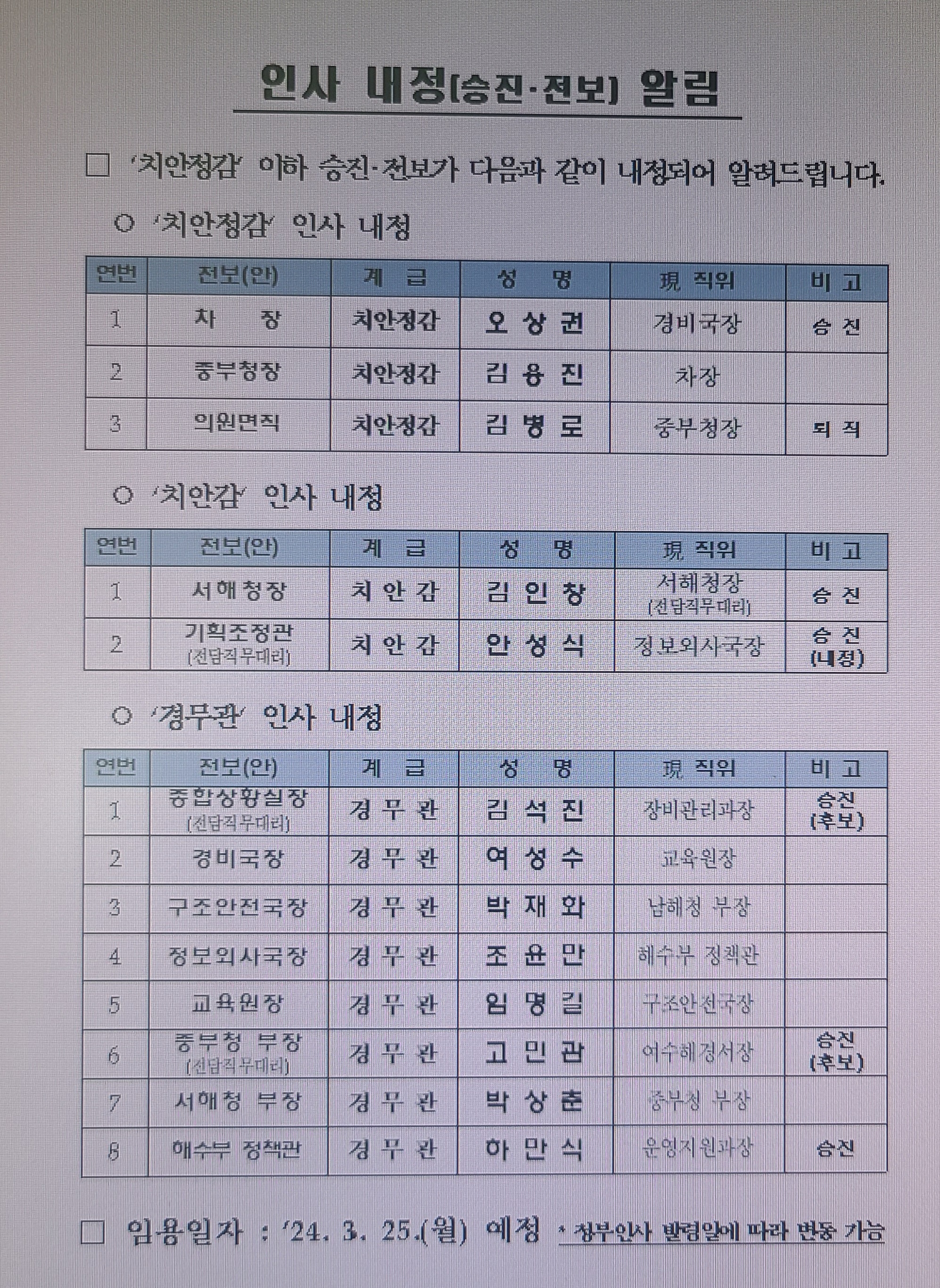 금일 3월18일) 해양경찰은 “치안정감” 이하 승진 전보를 아래와 같이 치안정감 3명 치안감 2명 경무관(8명)이 내정되었음을 발표하였다.