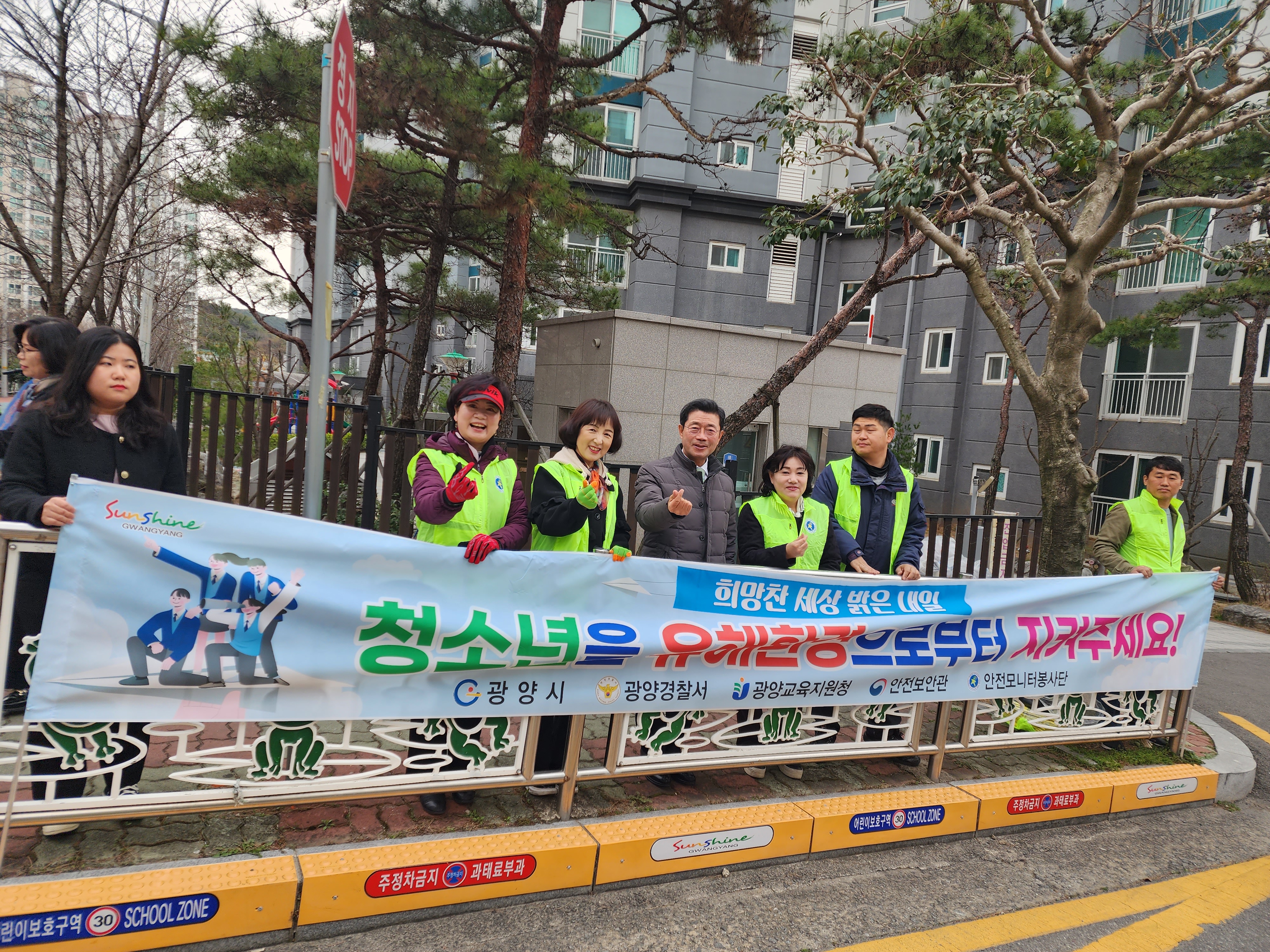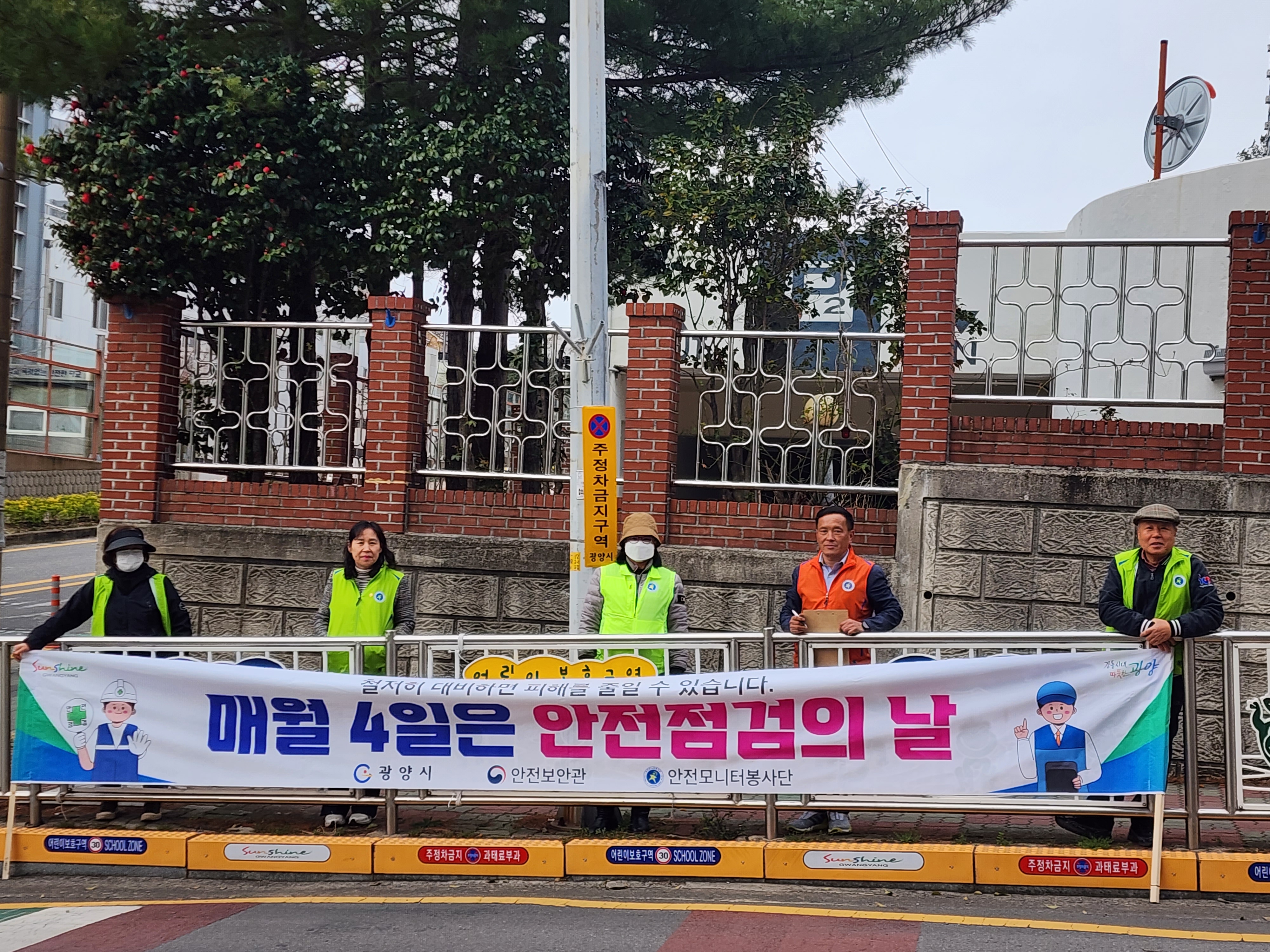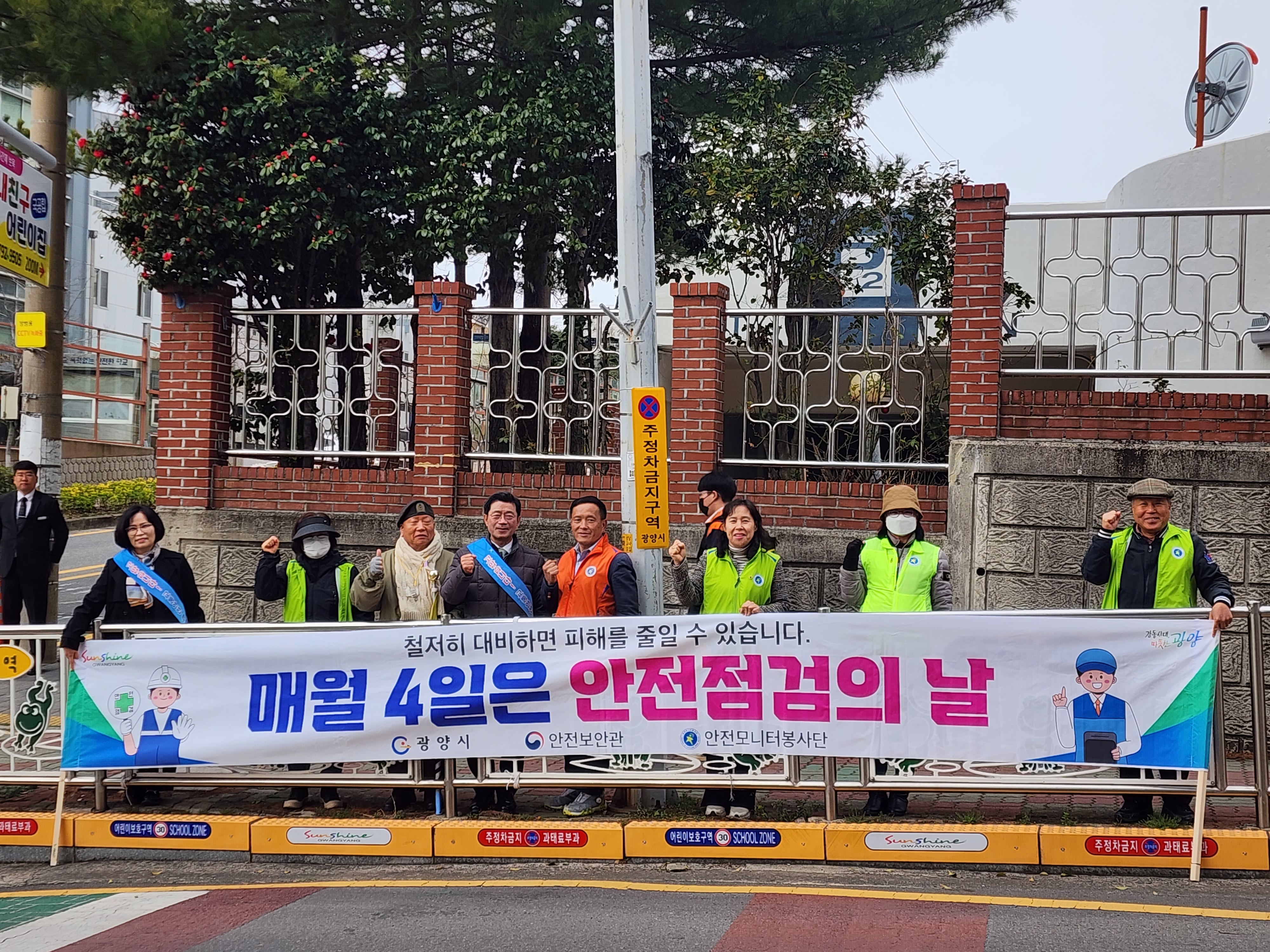 이번 점검은 3월19일~20일(2일간) 광양시,안전보안관.안전모니터봉사단.녹색어머니회.모범운전자회.마동초등학교 학생회.합동으로 중마동 마동초등학교. 앞에서 캠페인을 시작으로 지역 내 초등학교 대상으로 안전점검을 실시한다.