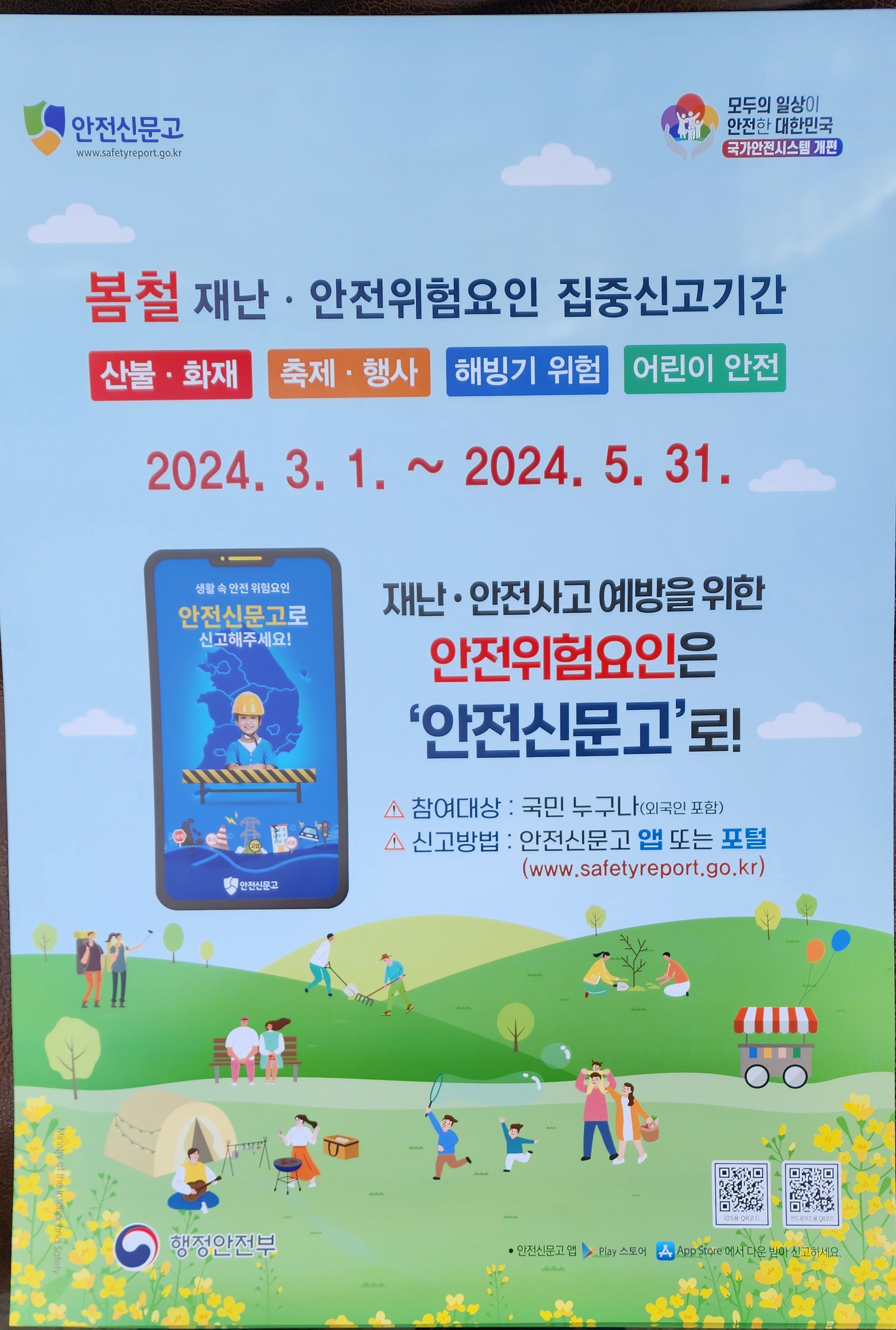 금일 초등학교주변 안전점검으로 10여건의 안전위험요소를 발굴하여 안전신문고에 신고하였다.