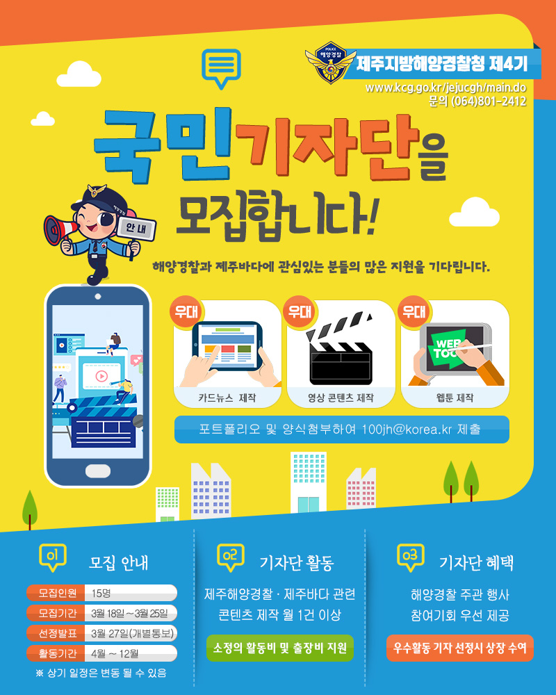 제주지방해양경찰청(청장 한상철)에서는 제주해양경찰의 주요 정책과 다양한 활동상을 국민에게 알리는 역할을 담당할 「제4기 제주해경청 국민기자단」 15명을 오는 25일(월)까지 모집한다고 밝혔다.