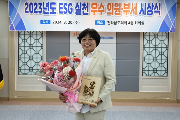 전남도의회 장은영 의원(더불어민주당, 교육위원회)이 3월 20일(수) 전라남도의회 4층 회의실에서 지난 2023년 8월 3일 제정된 「전라남도의회 이에스지(ESG) 실천 조례」에 따라 ‘2023년도 ESG 추진 우수 의원’으로 선정되어 수상하는 영예를 안았다.