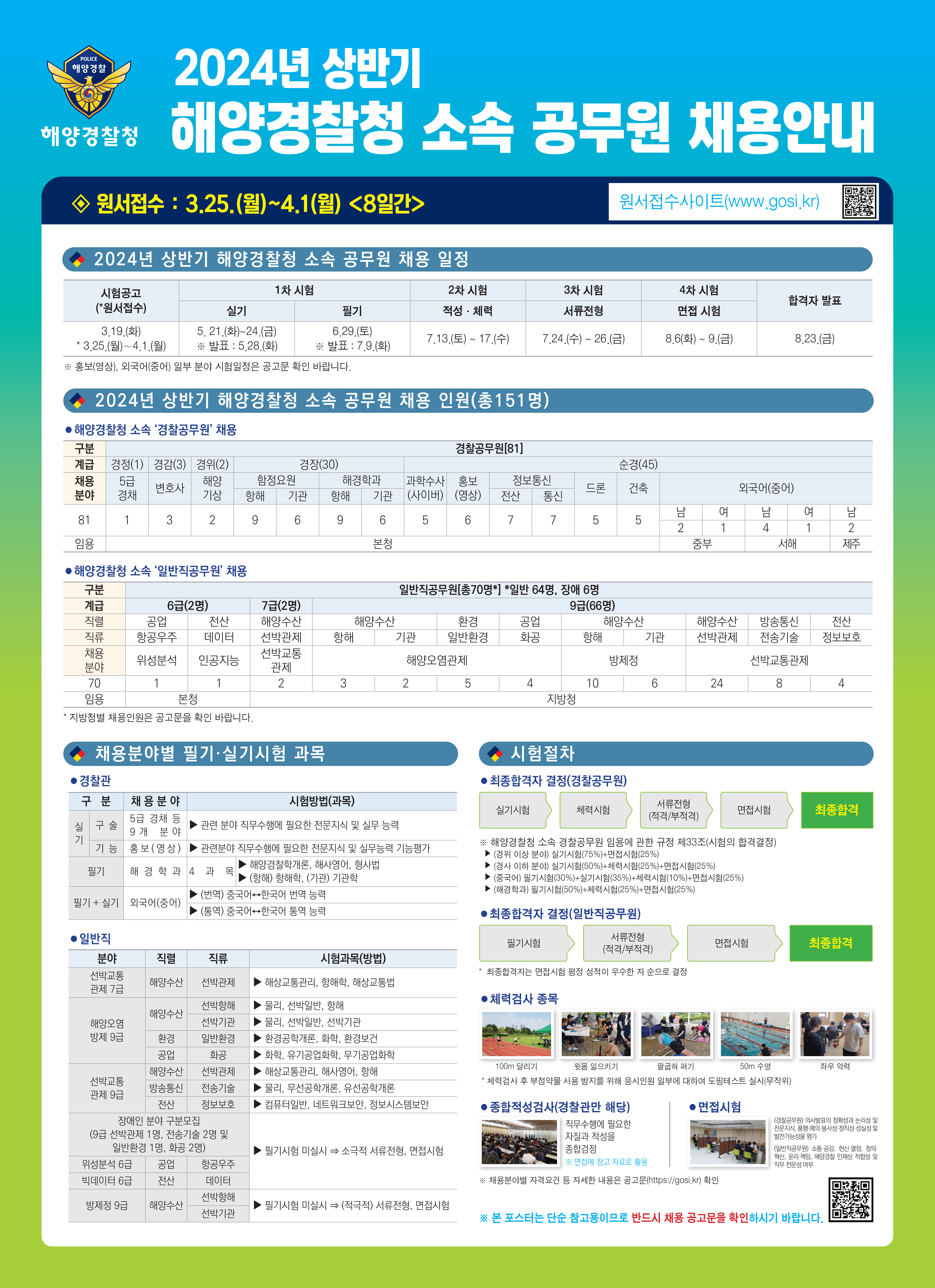 채용분야별 자격요건 등 보다 자세한 내용은 제주해경청(www.kcg.go.kr/jejucgh