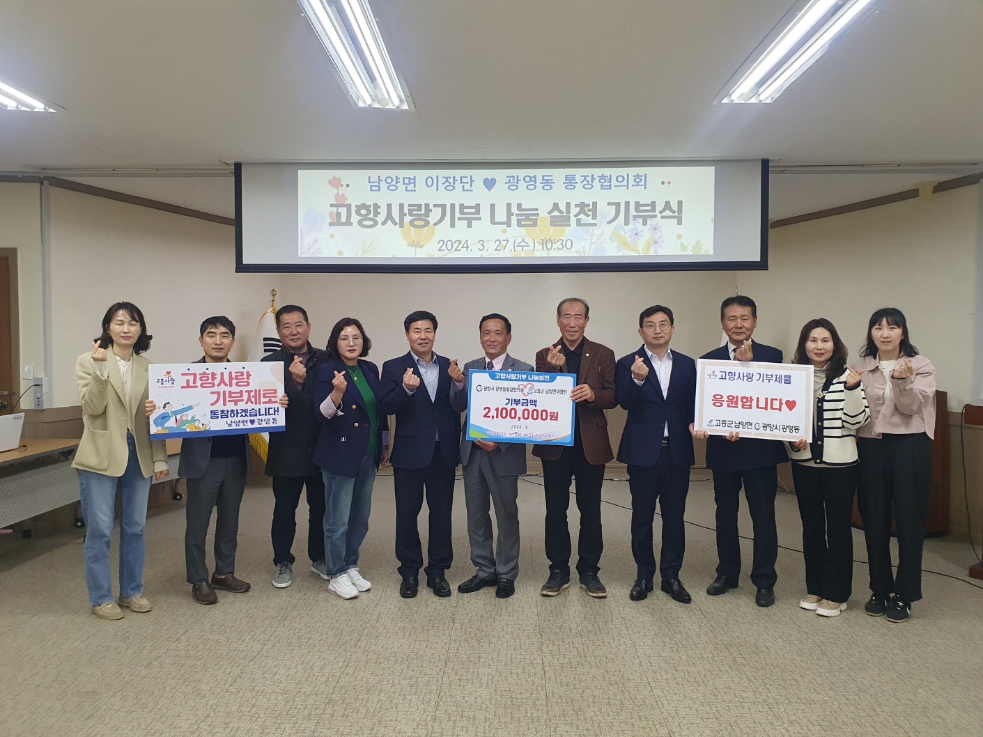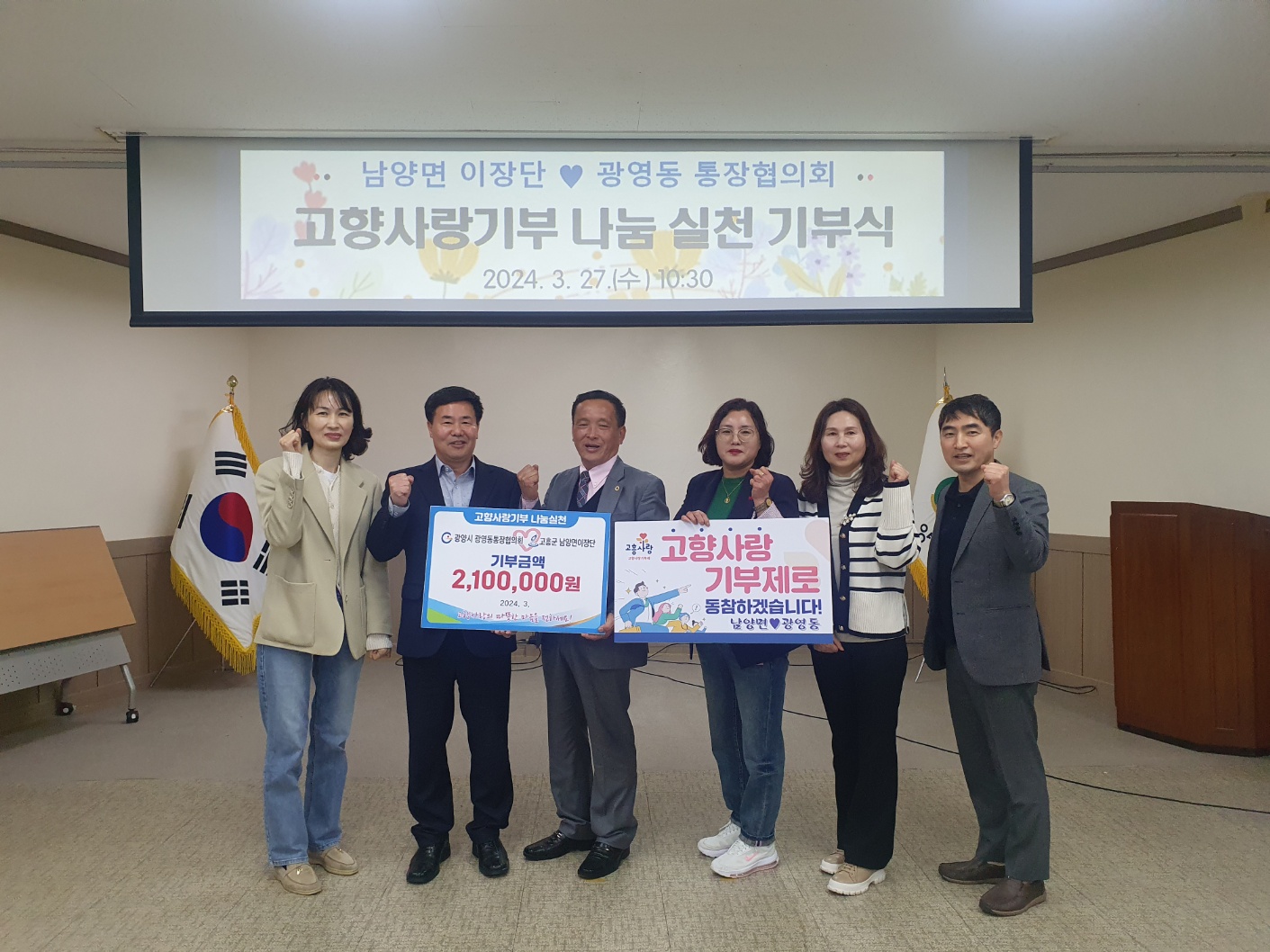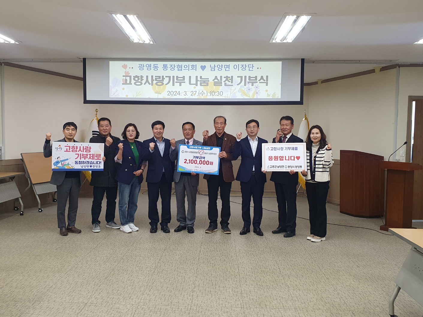 [해륙뉴스1]=서정민기자.광양시 광영동통장협의회(서정민회장)는 금일 (27일) 고흥군 남양면이장단(신문식단장)과 지역 균형발전 및 상생 협력 도모를 위한 고향사랑기부금 교차 기부식을 가졌다.