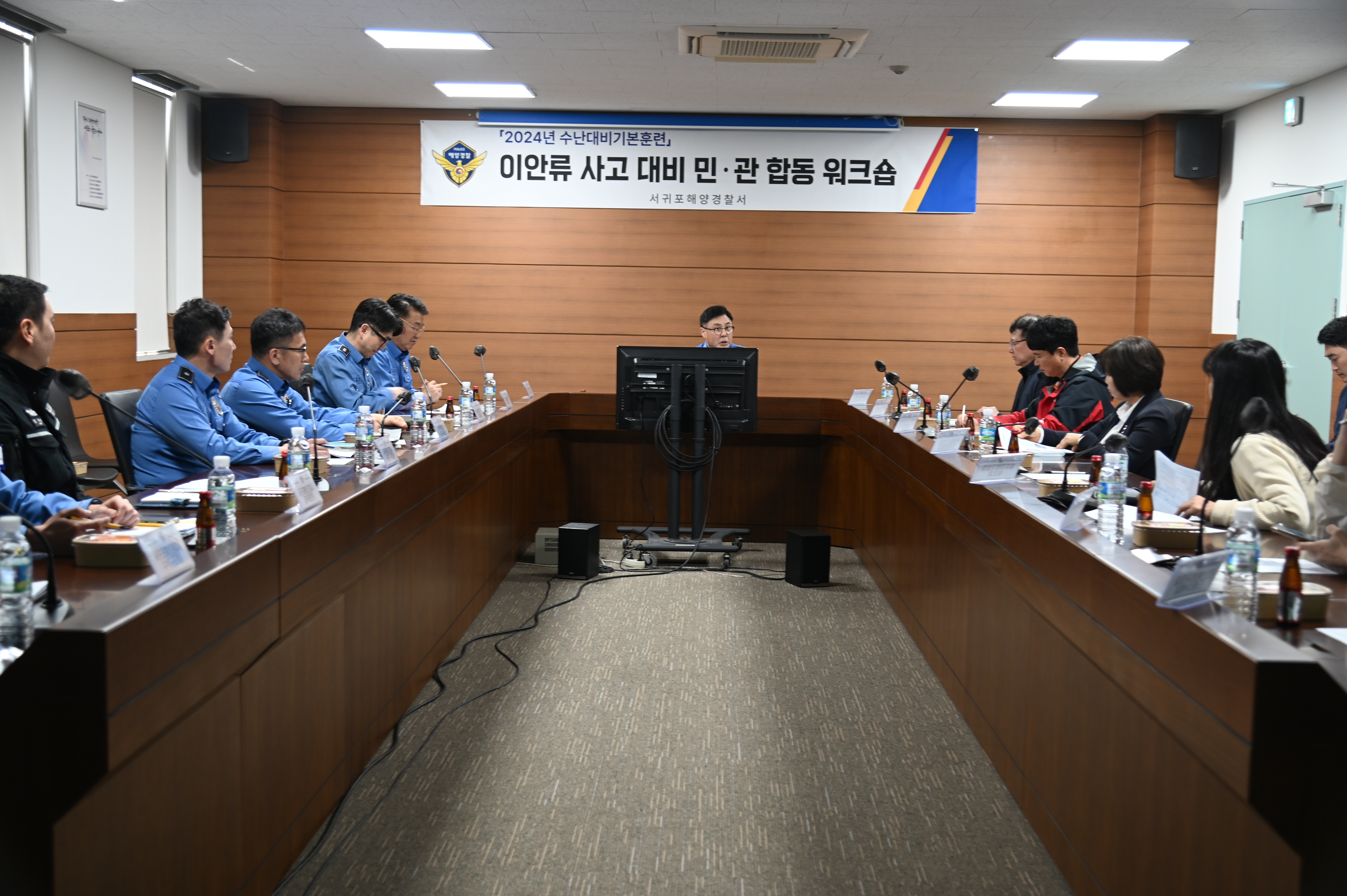 서귀포해양경찰서(서장 고성림)는 오늘(16일)“중문 색달해수욕장 이안류 발생으로 해수욕객 외해 표류 발생”을 가정한 수난대비 기본훈련에 앞서 유관기관 간 워크숍 가졌다.