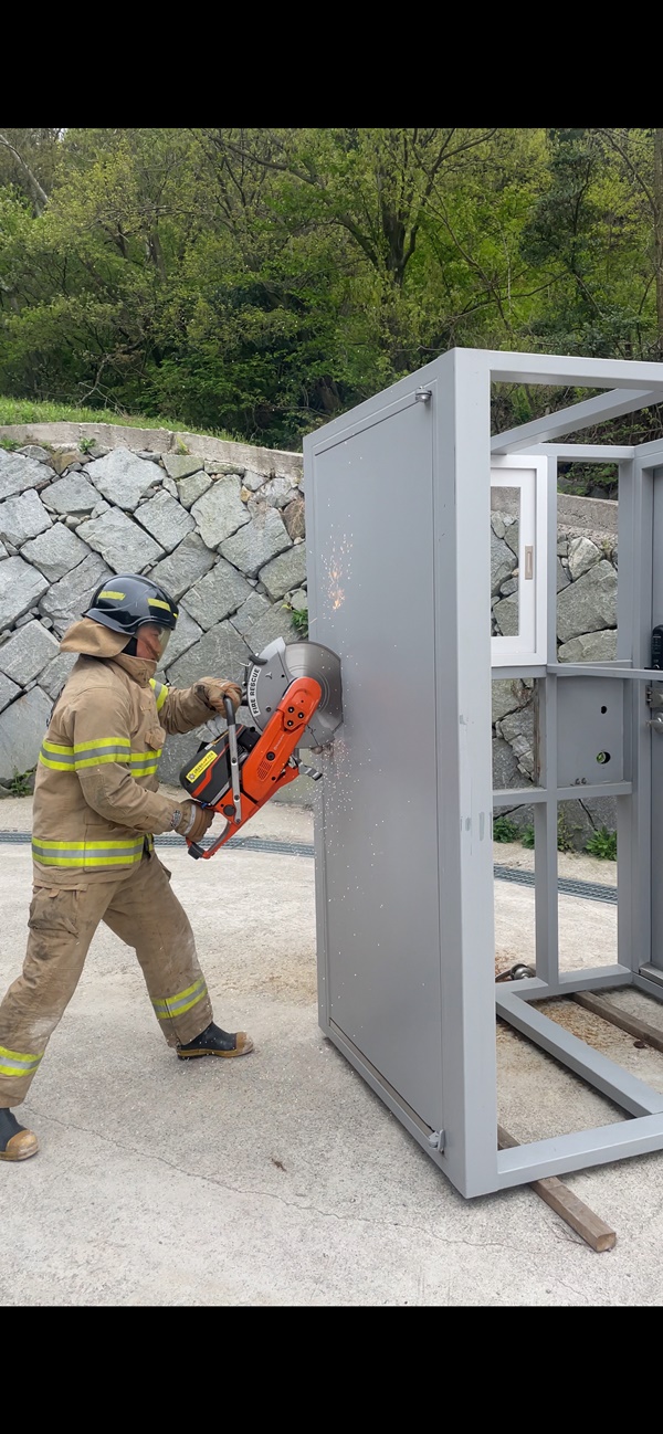 방화문 개방 훈련을 구조자가 고립되었을 때 방화문 개방을 얼마나 신속하고 정확하게 개방하는지에 따라 요구조자의 안전과 화재 양상이 달라질 수 있다. 이번 훈련에서는 동력절단기 사용, 방화문 해정기, 도어 오프너 등 방화문 개방에 필요한 장비를 활용해 실전과 같이 진행한다.