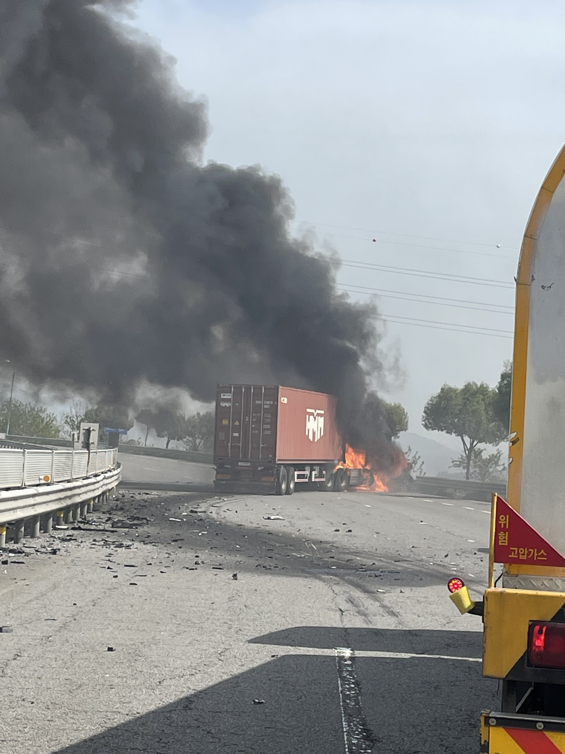 [해륙뉴스1]=서정민기자.금일(4월19일)14시40분경 순천에서 광양컨테이너부두 자동차전용도로(초남대교부분 커브길)에서 SUV차량과 트레일러차량이 정면충돌후 화재가 발생하였다.