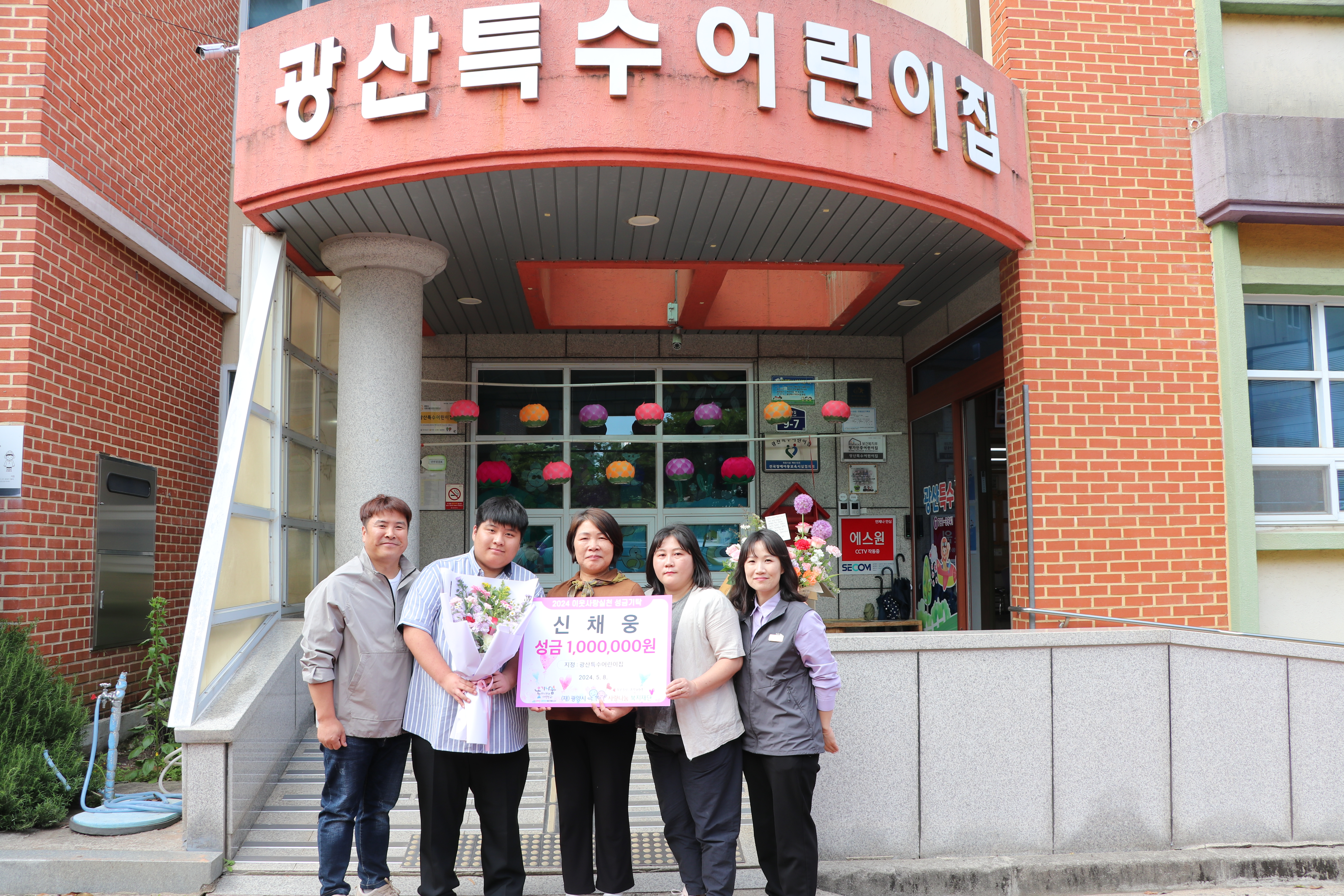 이날 전달한 성금은 광산특수어린이집 졸업생인 신채웅 학생이 본인에게 많은 도움을 준 어린이집에 감사의 마음을 담아 용돈을 모아 마련한 것으로 광산특수어린이집에 지정기탁되어 어린이집을 이용하는 아동들을 위해 사용될 예정이다.
