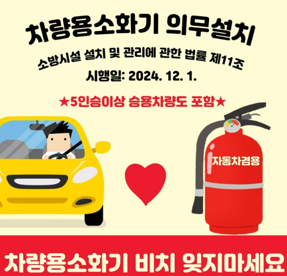 [해륙뉴스1]=서정민기자.광양소방서(서장 정강옥)는 2024년 12월1일부터 차량용 소화기는 기존 7인승 이상의 승용자동차에서 5인승 이상의 승용자동차로 확대되어 의무적으로 비치해야 한다고 24일 밝혔다.