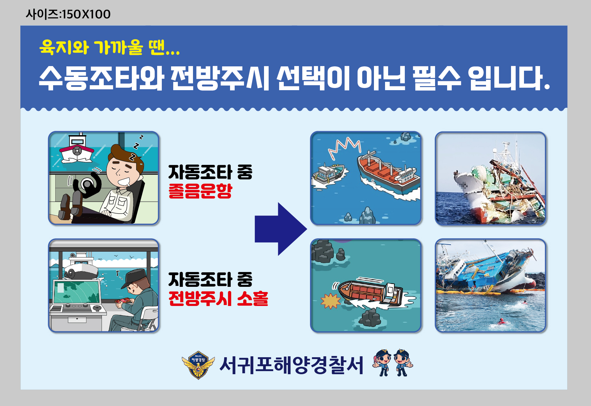 서귀포해경은‘수동조타와 전방주시 선택이 아닌 필수’라는 문구를 내세워 홍보 스티커를 관내 선박에 부착해 어민들의 현장 안전의식을 고취 할 수 있도록 집중 홍보를 시행했다.