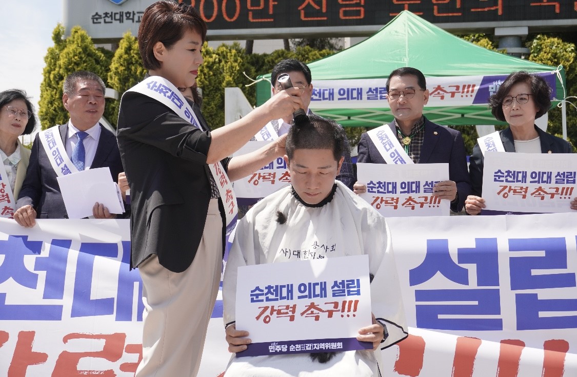 이날 출정식은 순천대 의대 설립 결의를 다지기 위해 김진남 의원의 삭발식을 진행하고, 순천 지역당원과 시민, 신민호·김정희 도의원, 나안수·강형구·이영란·김미연·정홍준·김태훈·신정란·장경순 순천시의원 등 50여 명이 참석한 가운데 순천대학교 의과대학 설립의 필요성과 전남도의 단일 의대 공모 계획 철회를 강력히 요구하는 내용으로 진행됐다.