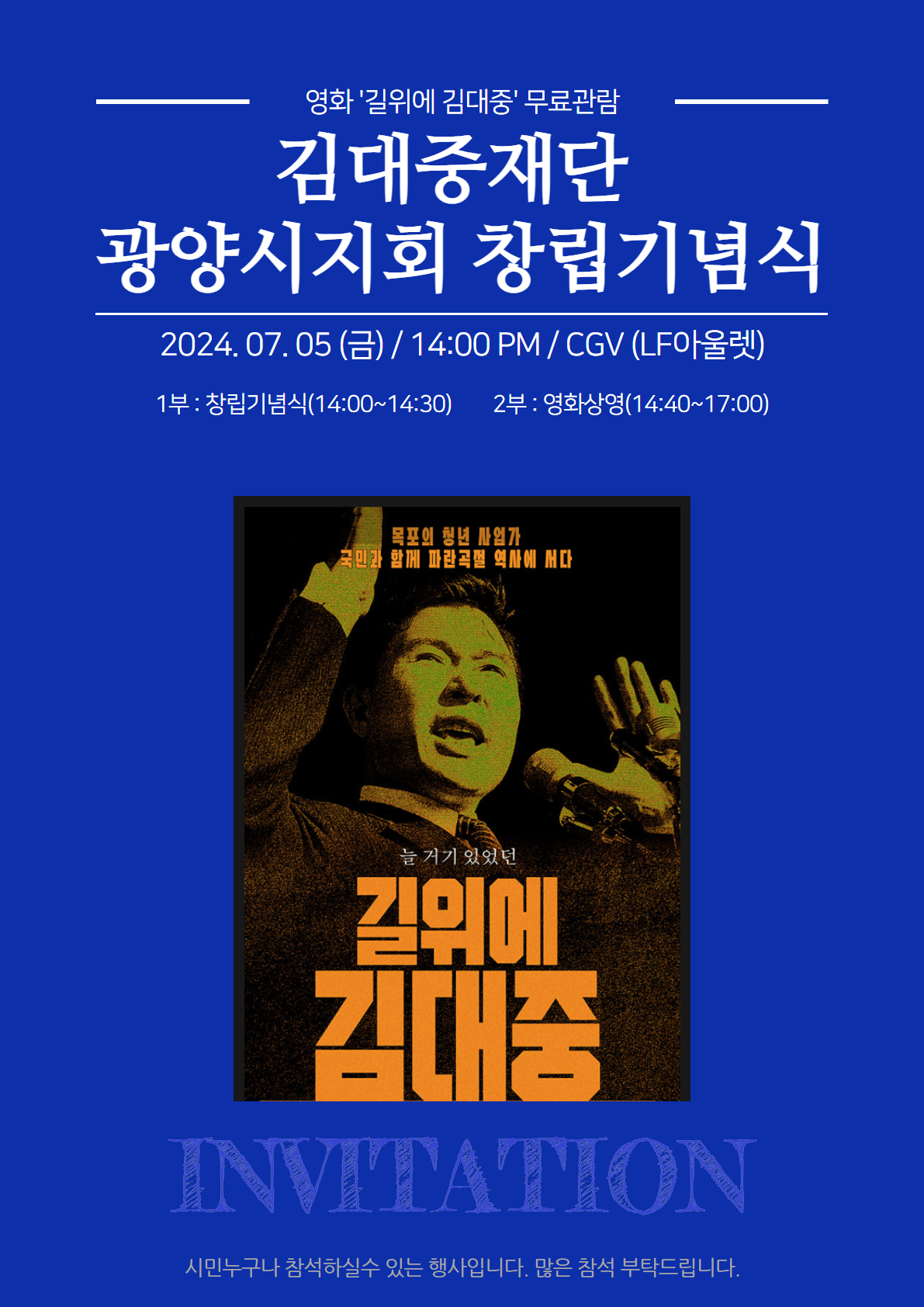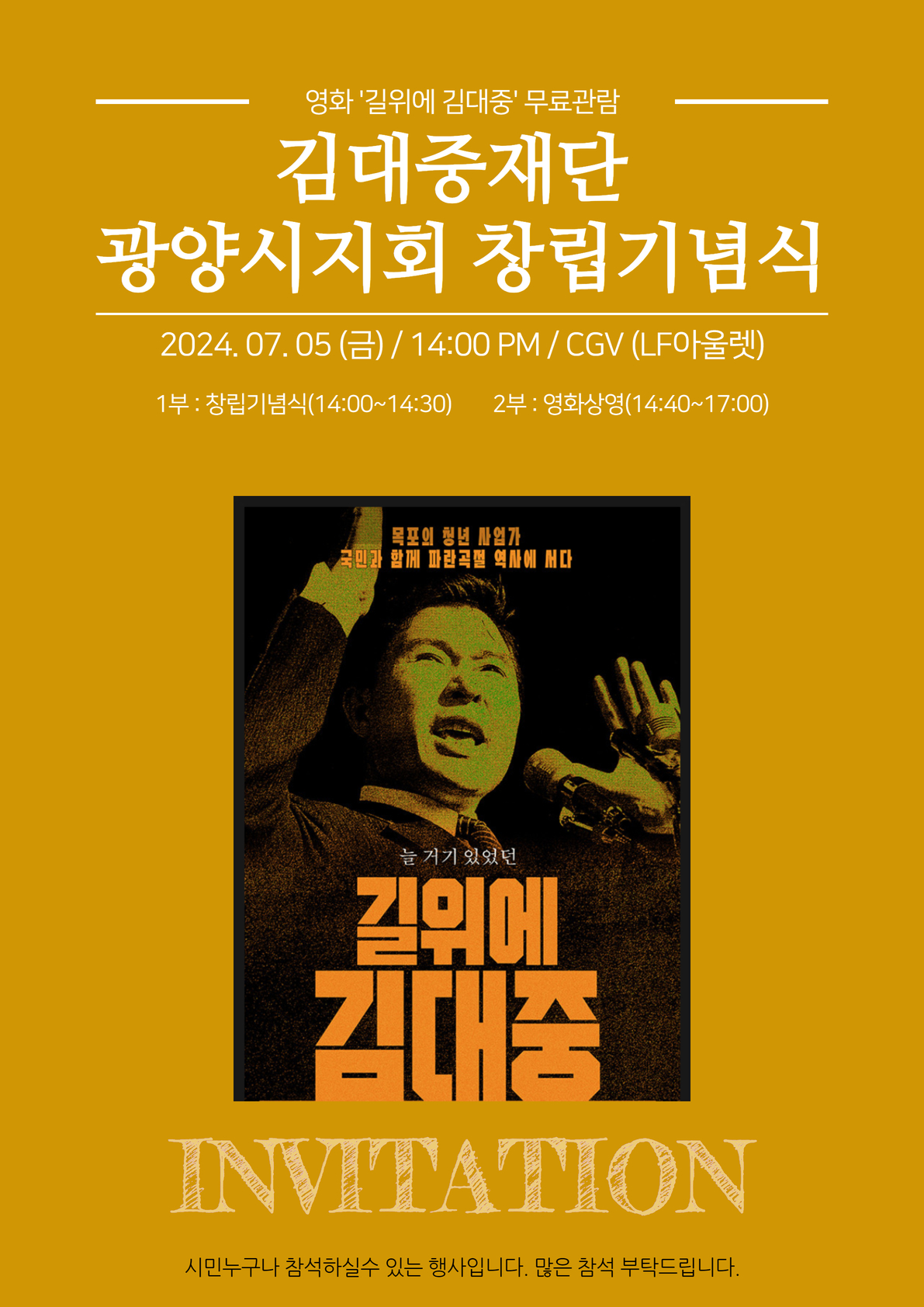 김대중재단 광양시지회(지회장 이충재)가 오는 7월 5일 오후 2시 광양읍 CGV 광양LF스퀘어점에서 창립기념식을 개최한다.
