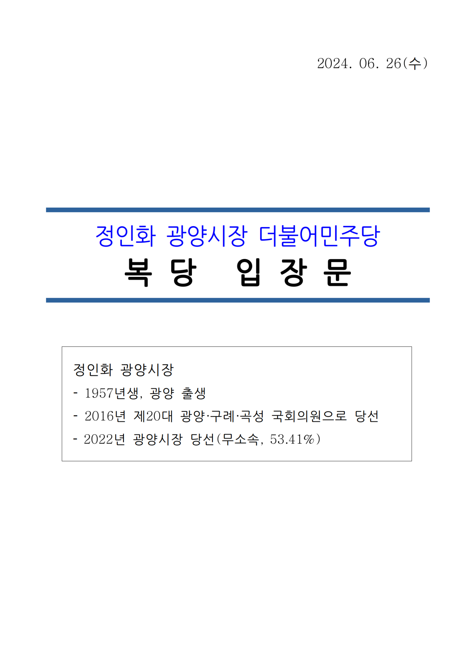 지난 6월7일 더불어민주당에 복당 안건이 최고회의를 통과, 이에 따라 정인화 광양시장이 오늘(6월26일 수) 입장문을 발표하였다.