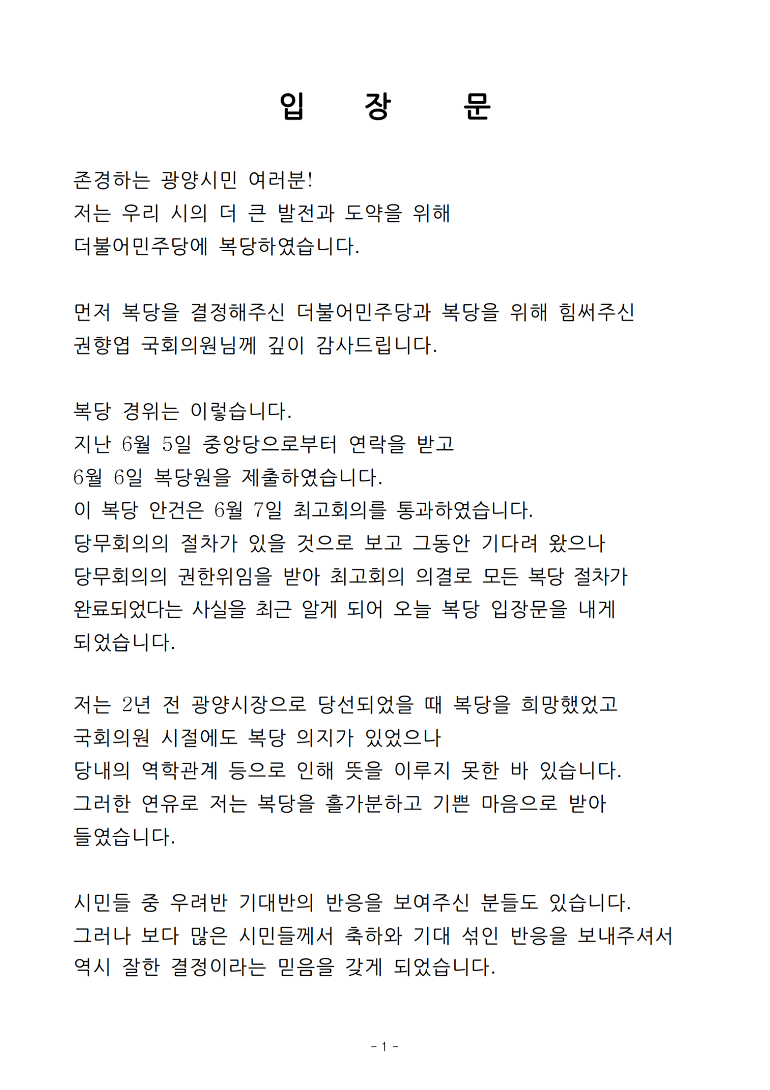 먼저 복당을 결정해주신 더불어민주당과 복당을 위해 힘써주신 권향엽 국회의원님께 깊이 감사드립니다.