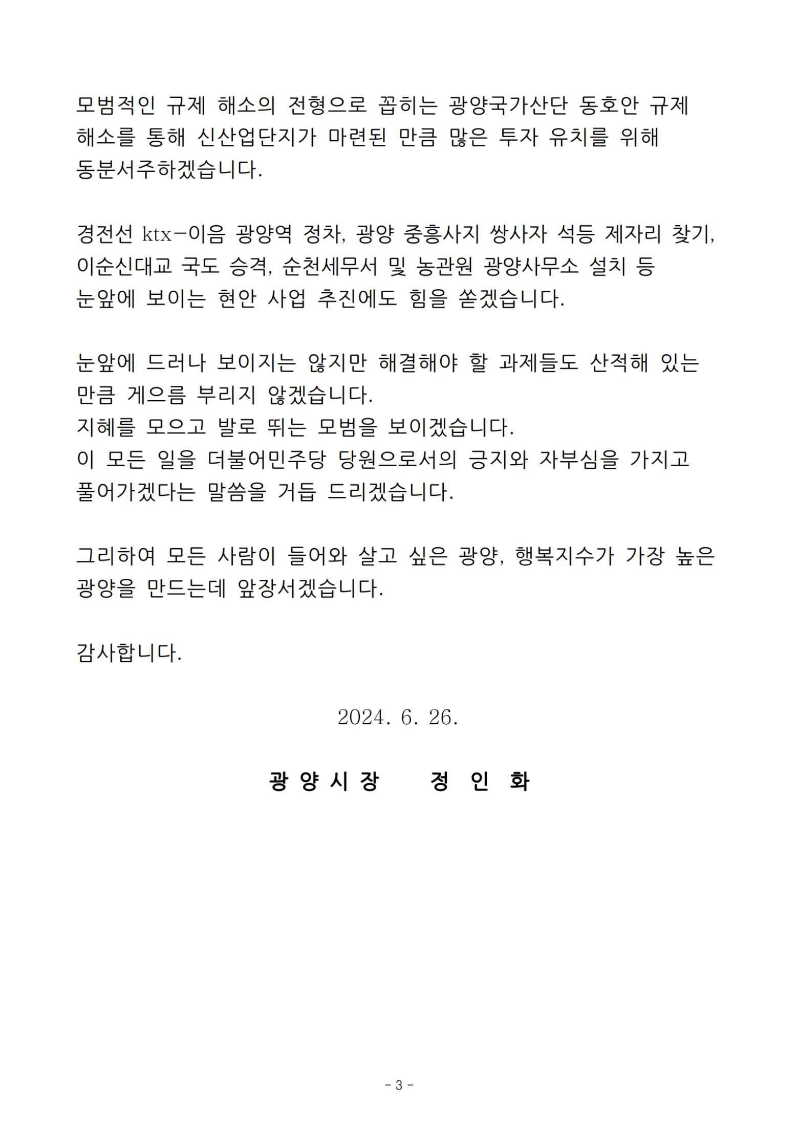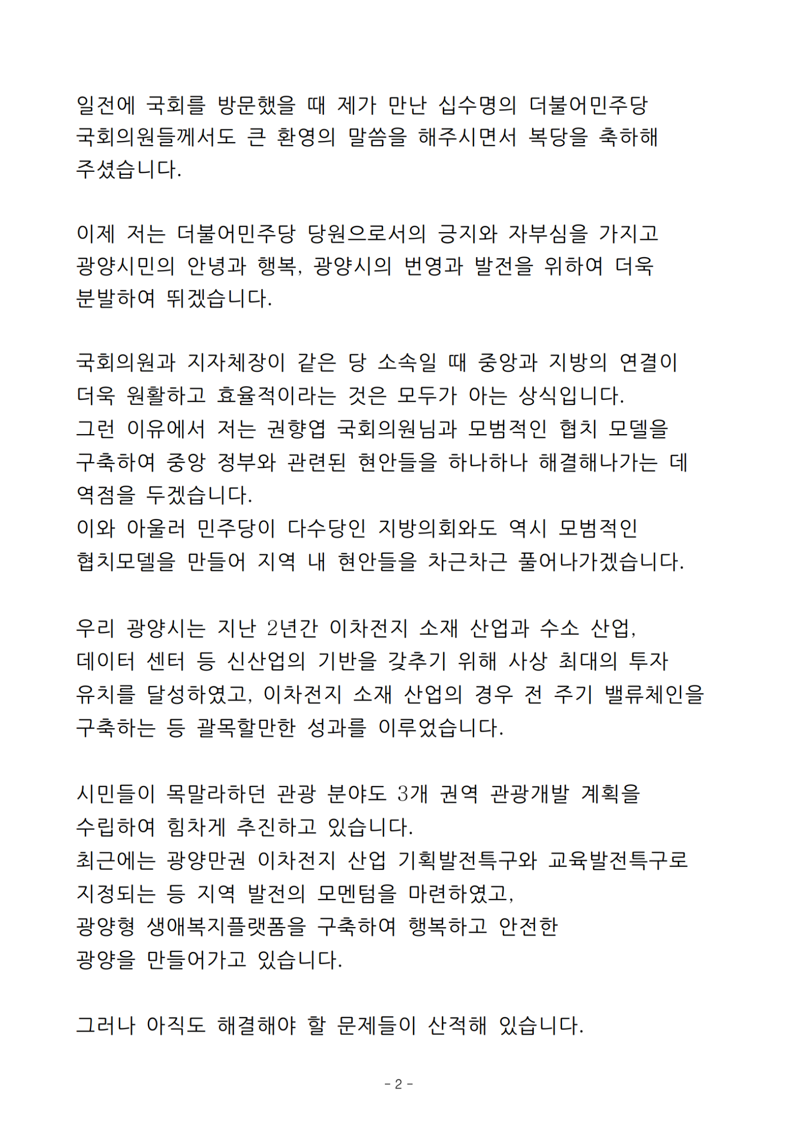이제 저는 더불어민주당 당원으로서의 긍지와 자부심을 가지고 광양시민의 안녕과 행복, 광양시의 번영과 발전을 위하여 더욱 분발하여 뛰겠습니다.