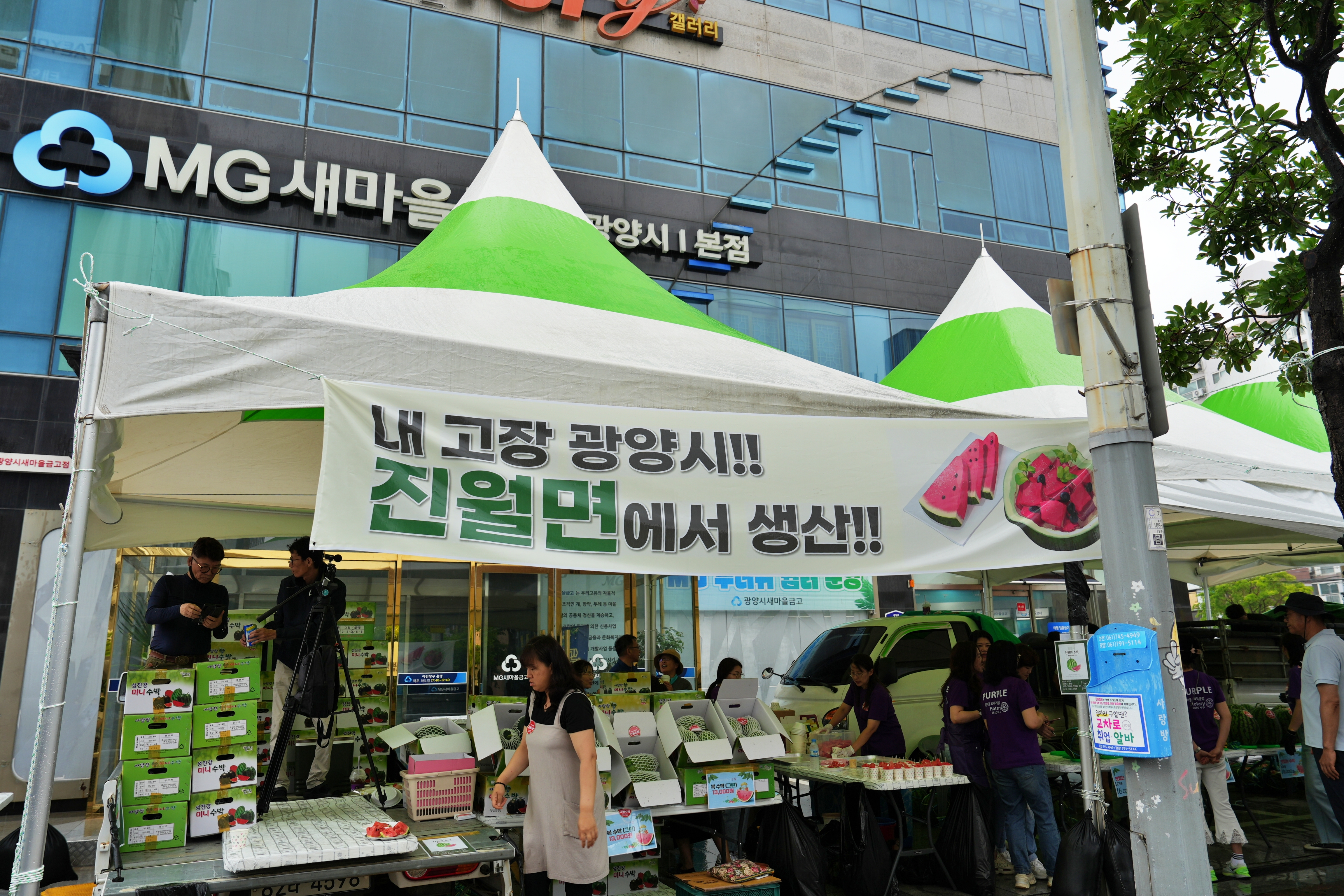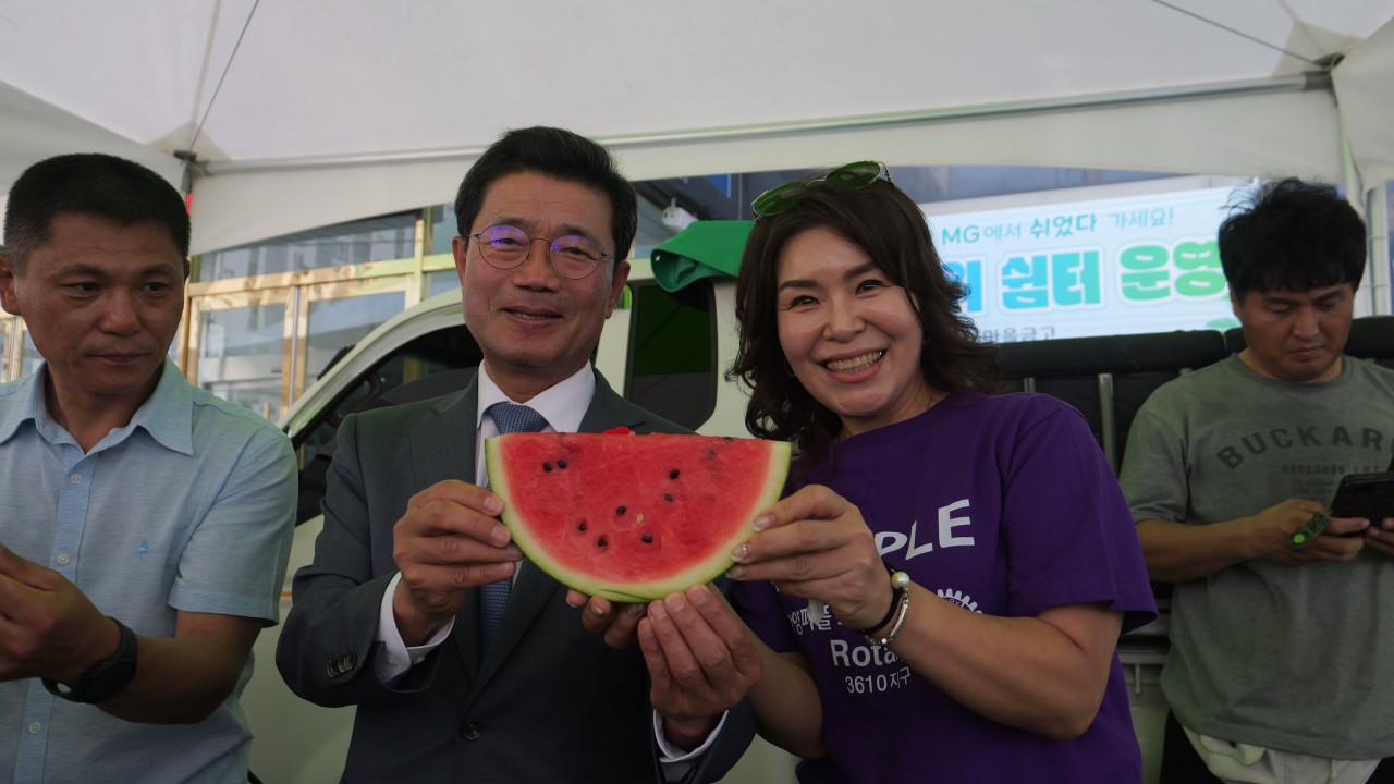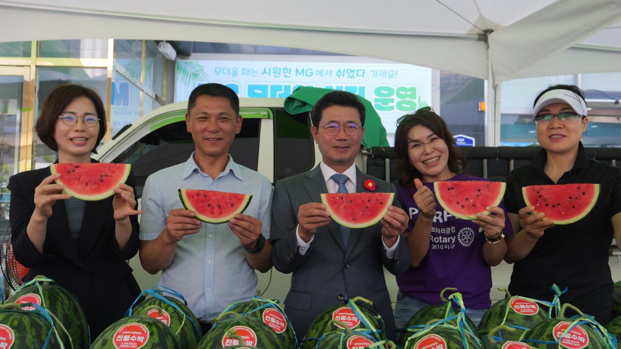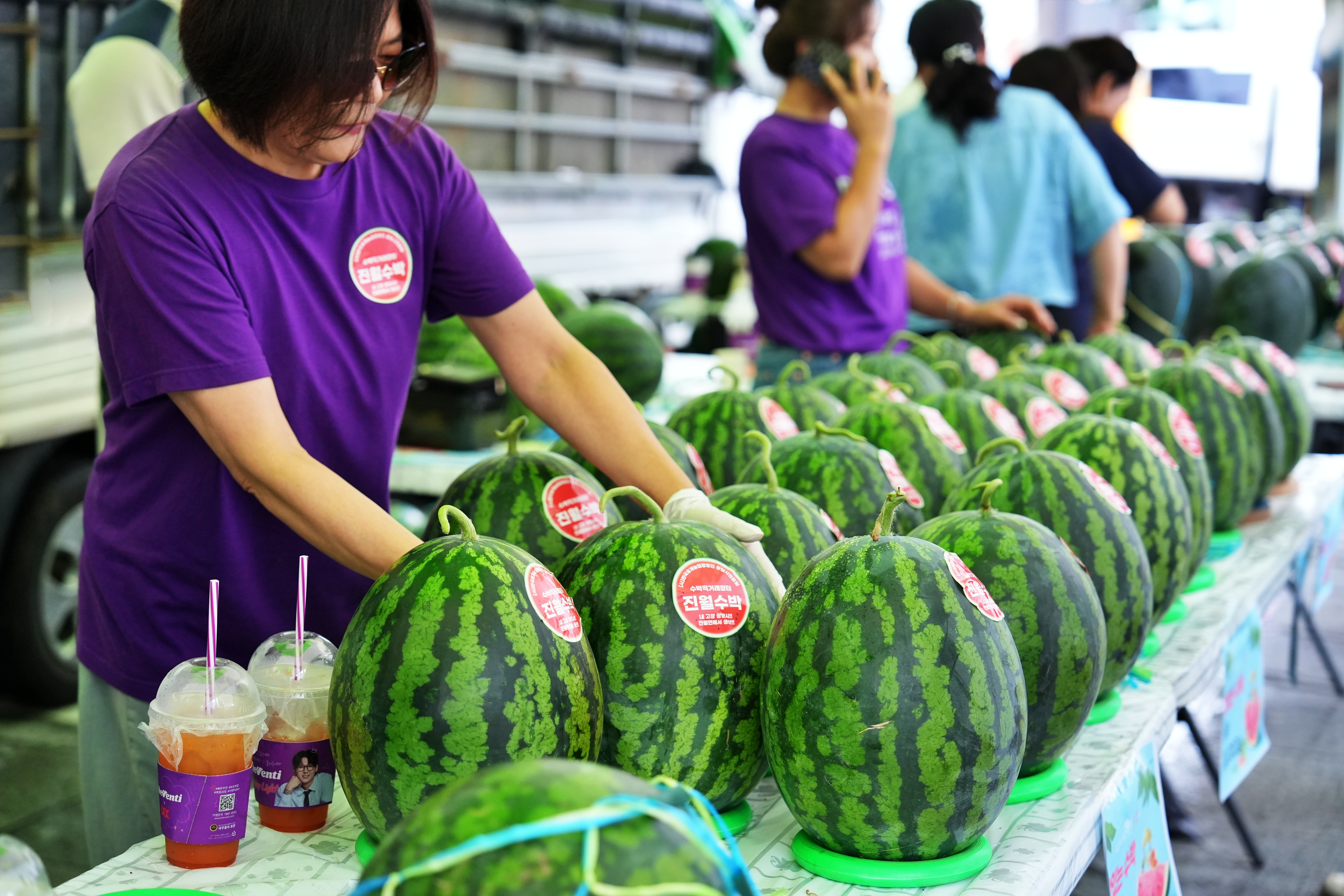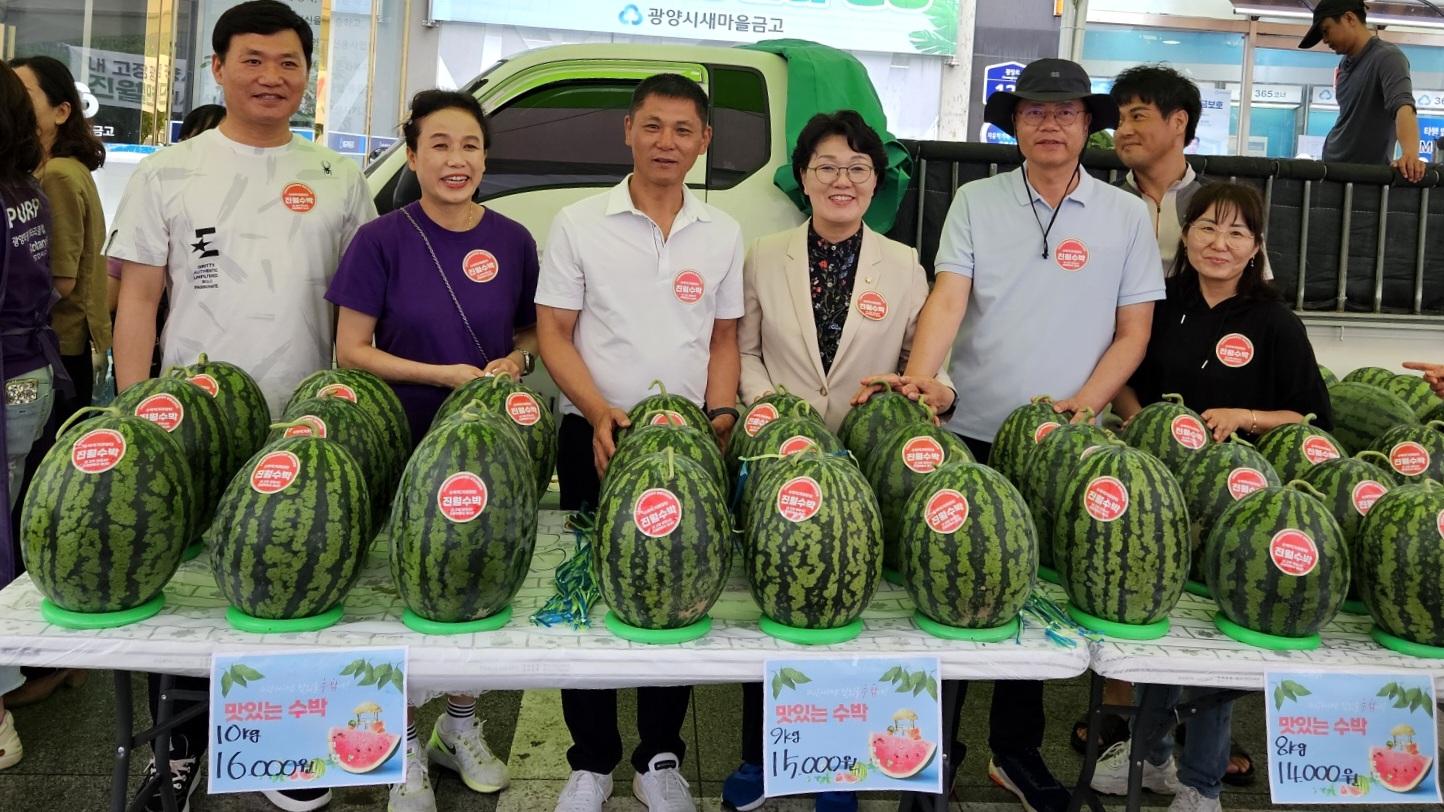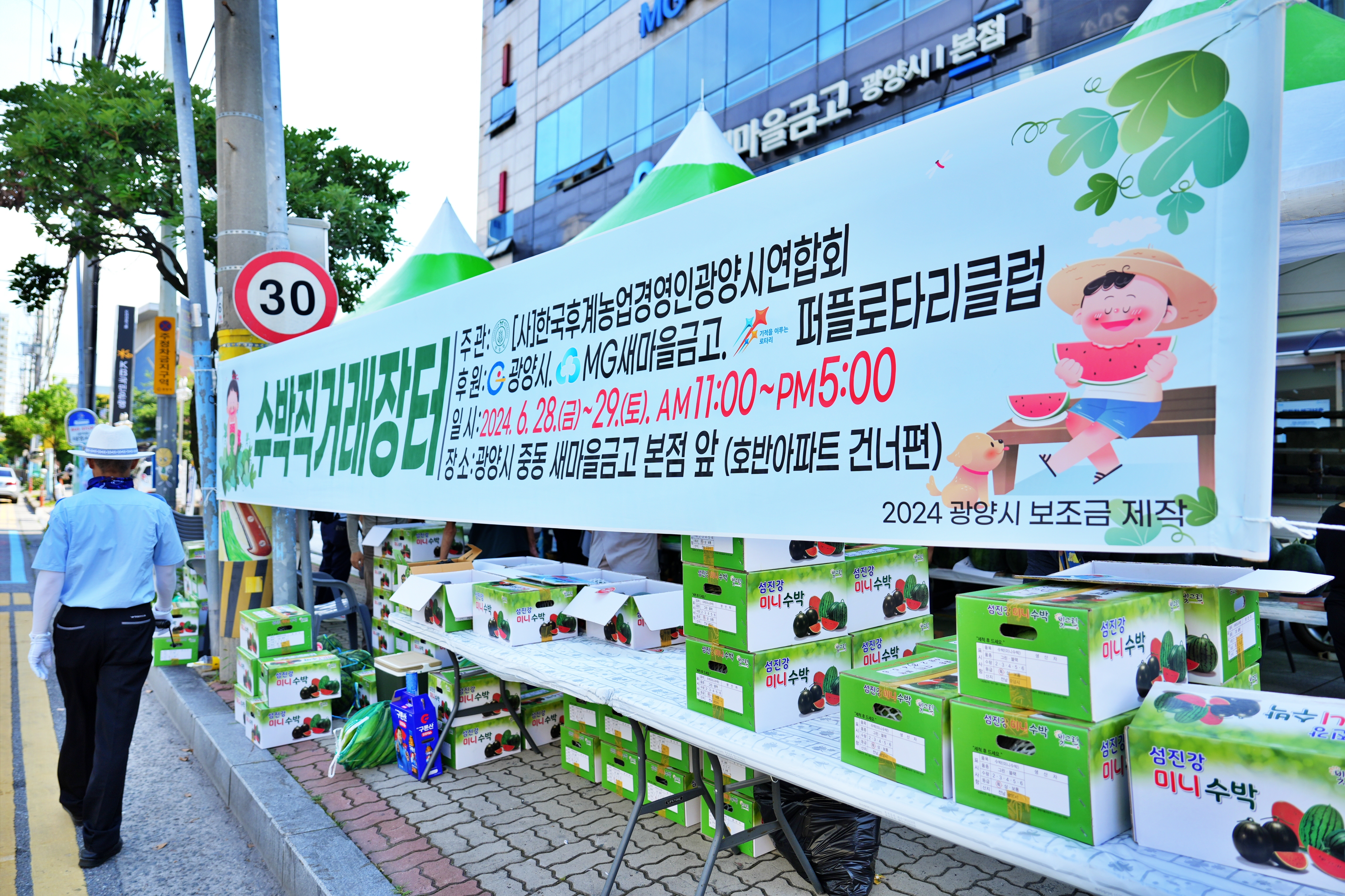 (사)한국농업경연인 광양시연합회(회장 이기욱)가 28일부터 29일까지, 이틀 간 중동 새마을금고 본점 앞에서 ‘2024년 수박 직거래 장터’를 열였다. 광양시와 MG새마을금고, 퍼플로타리클럽이 뜻을 함께하고 힘을 보탰다.