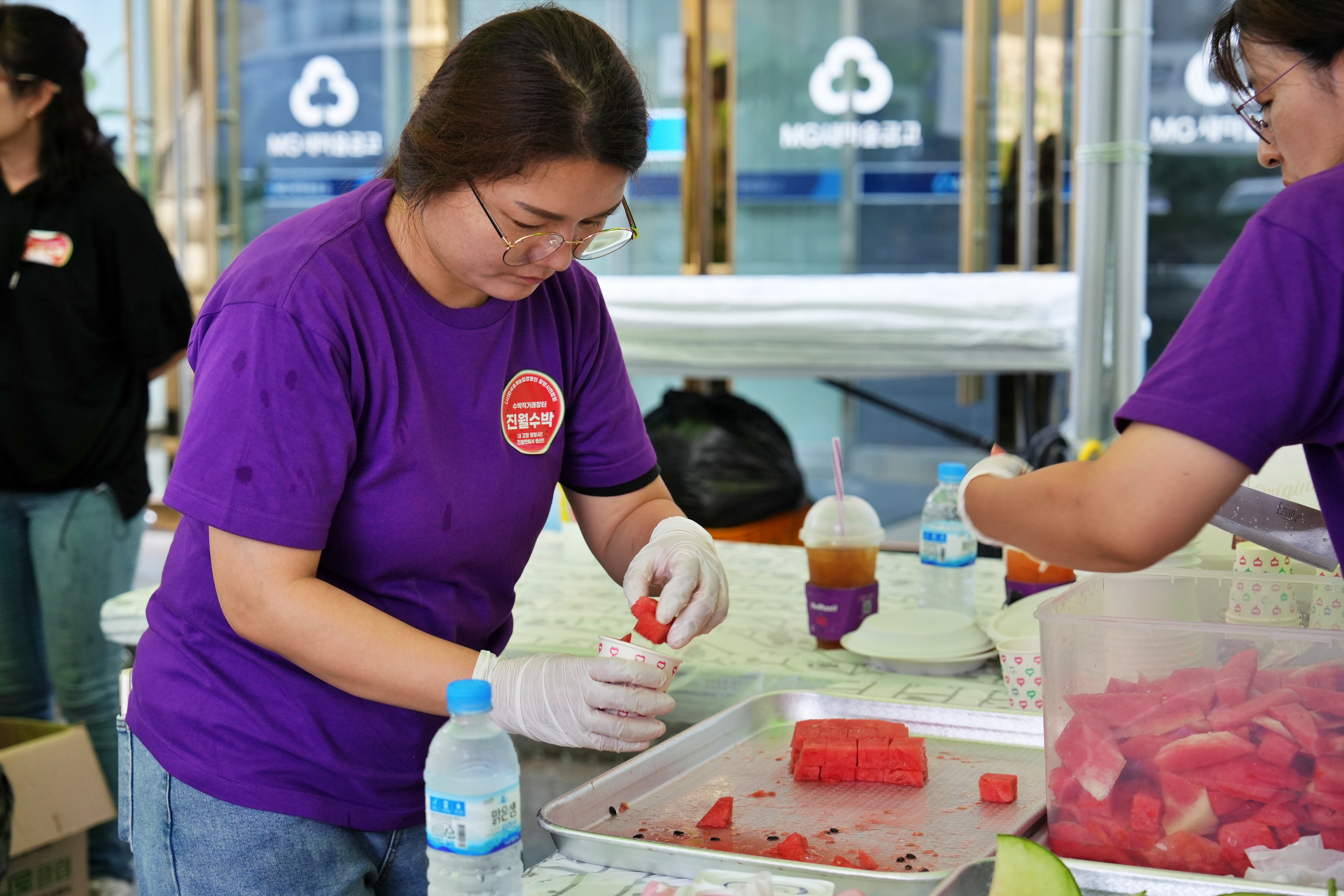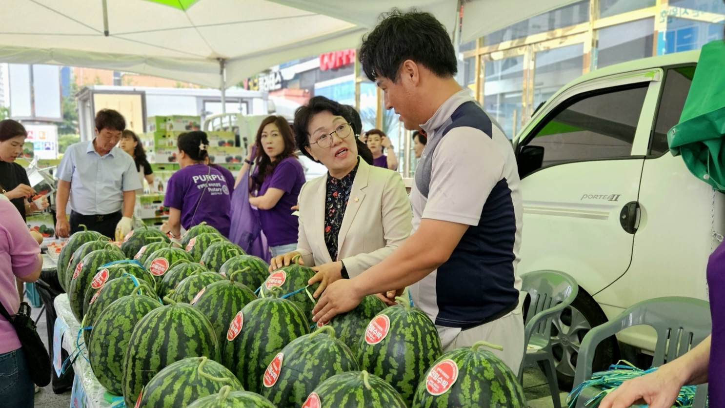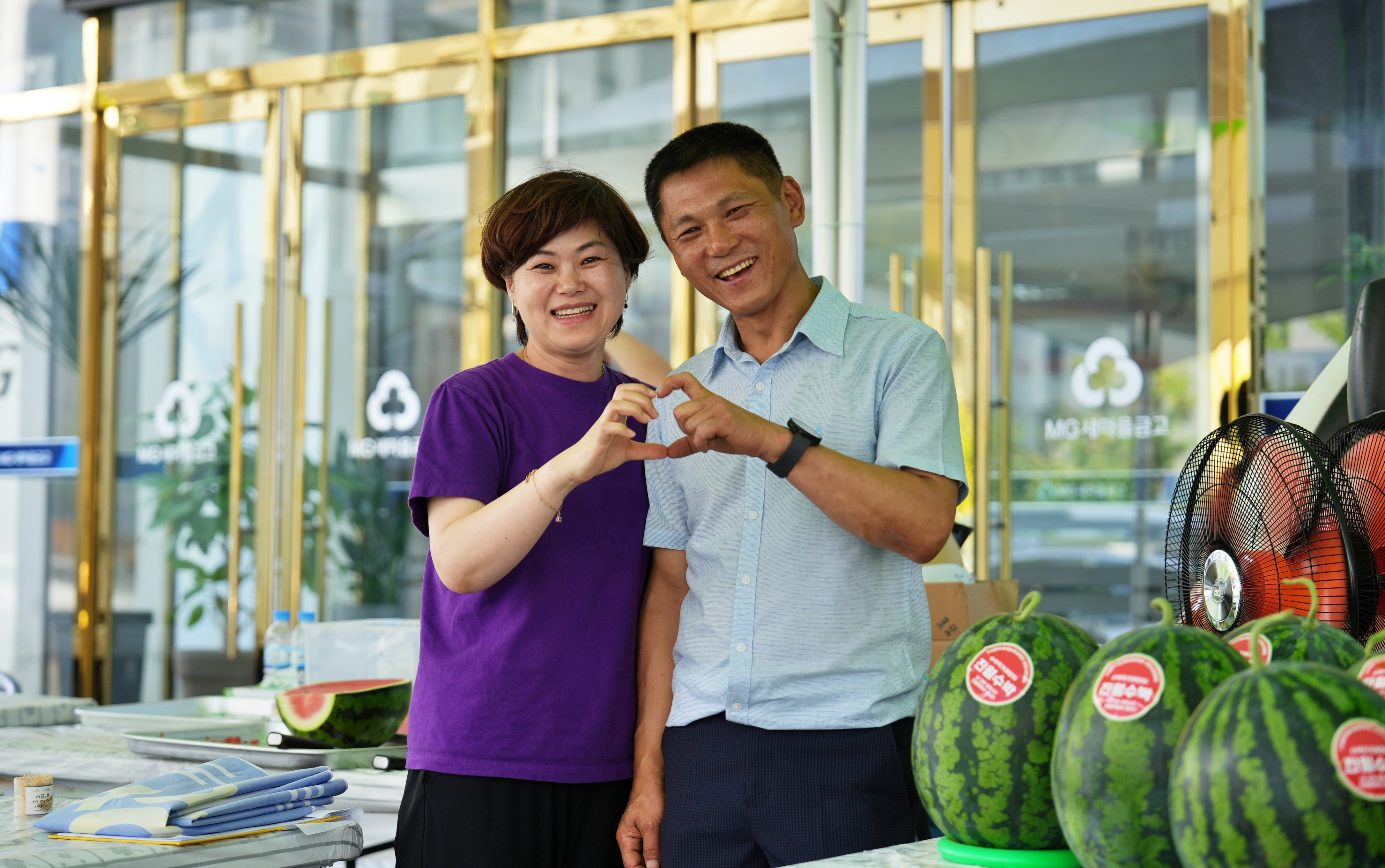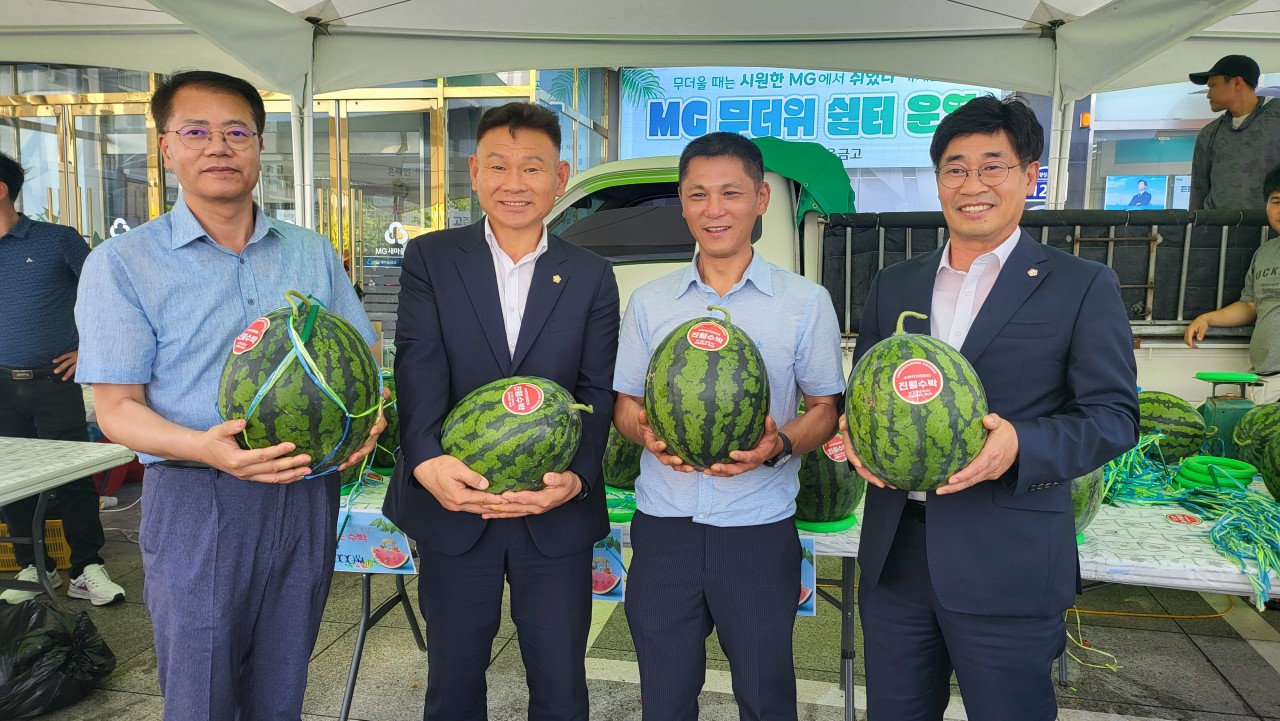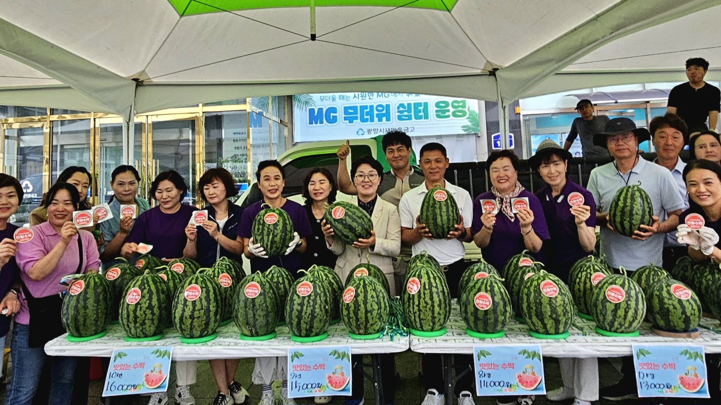 (사)한국농업경연인 광양시연합회(회장 이기욱)가 28일부터 29일까지, 이틀 간 중동 새마을금고 본점 앞에서 ‘2024년 수박 직거래 장터’를 열였다. 광양시와 MG새마을금고, 퍼플로타리클럽이 뜻을 함께하고 힘을 보탰다.