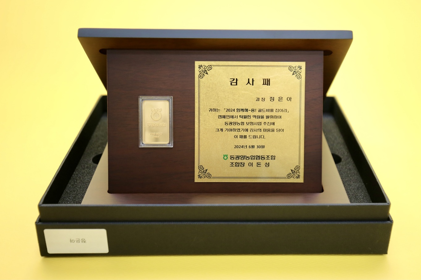 정은아 보험과장은 “파격적인 시상을 적극 반영 해주신 조합장님께 감사드린다”며, “하반기에도 적극적으로 업무추진을 하여 동광양농협이 보험연도대상을 수상하도록 박차를 가하겠다”고 말했다.