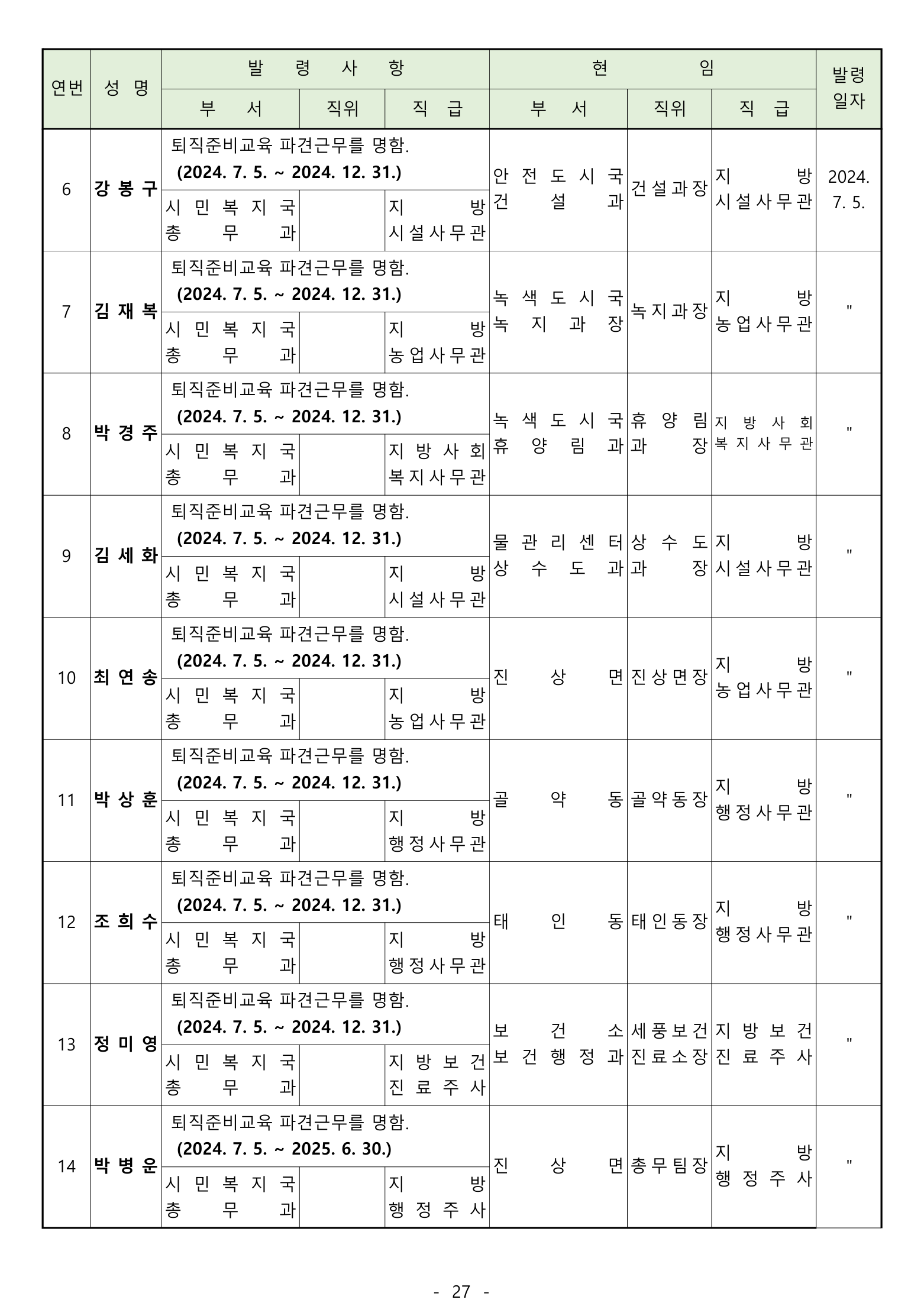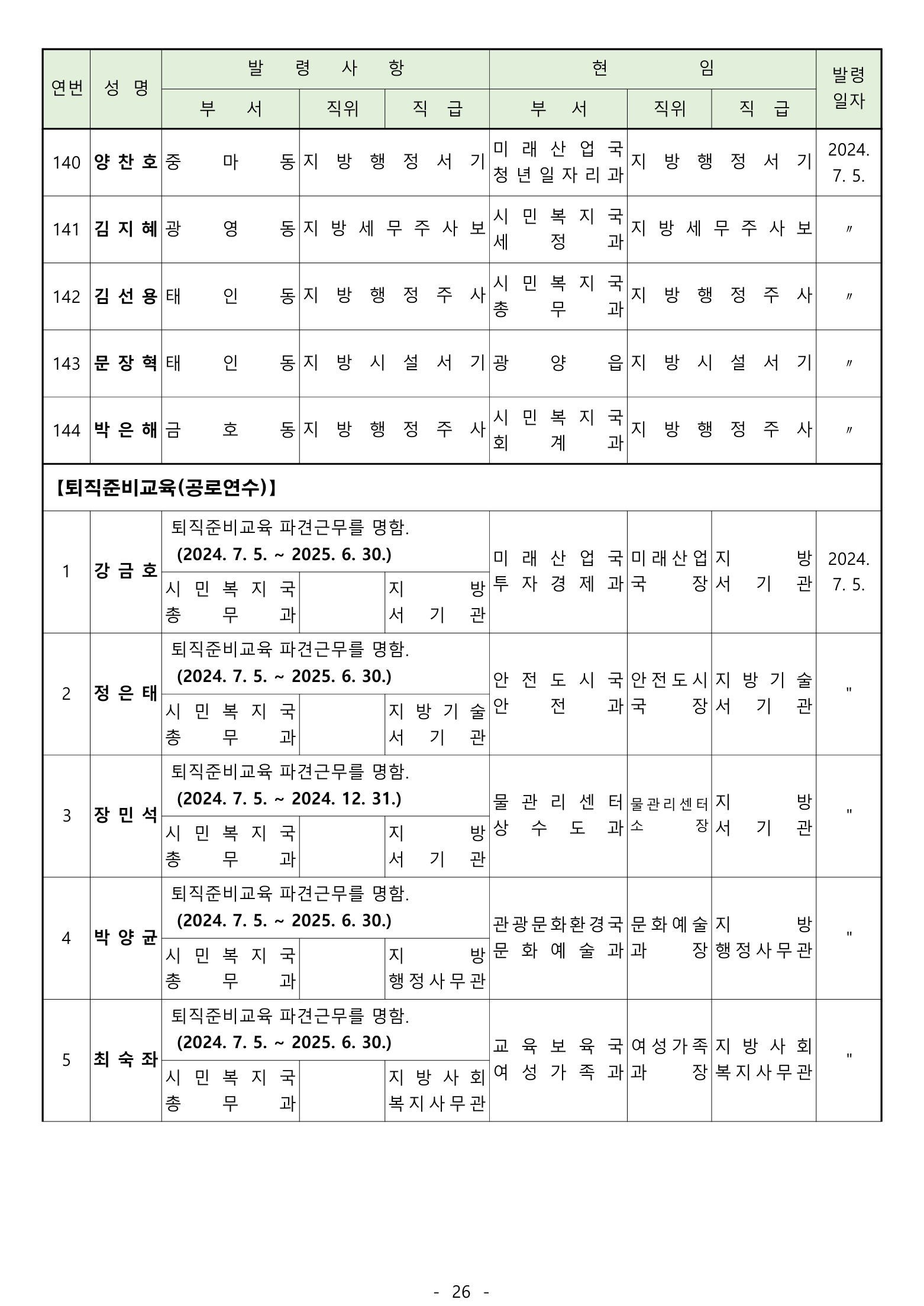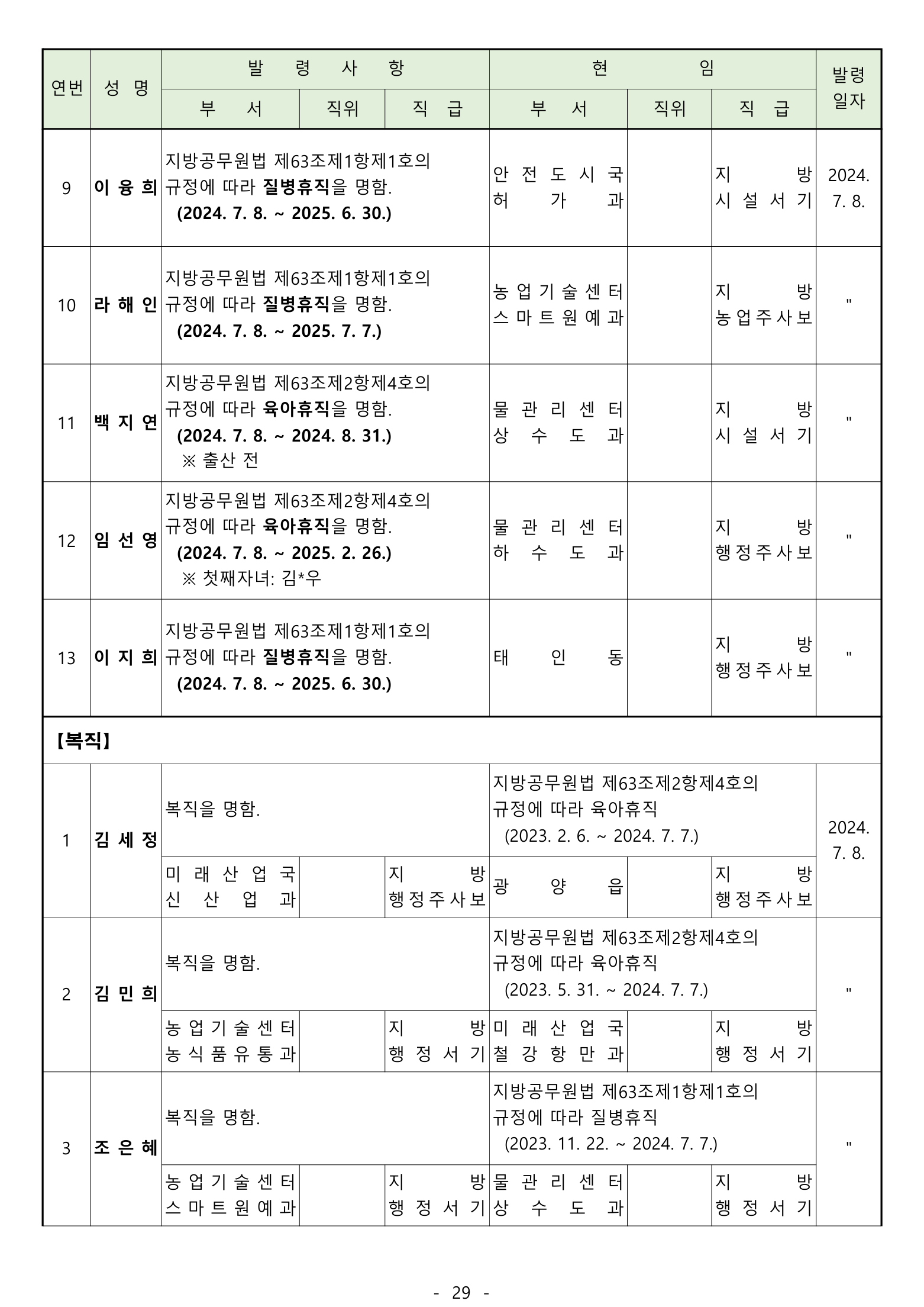 ‘ 전입 2며. 공로연수 14명, 휴직 13명, 복직 5명, 작무파견 1명, 의원면직 1명