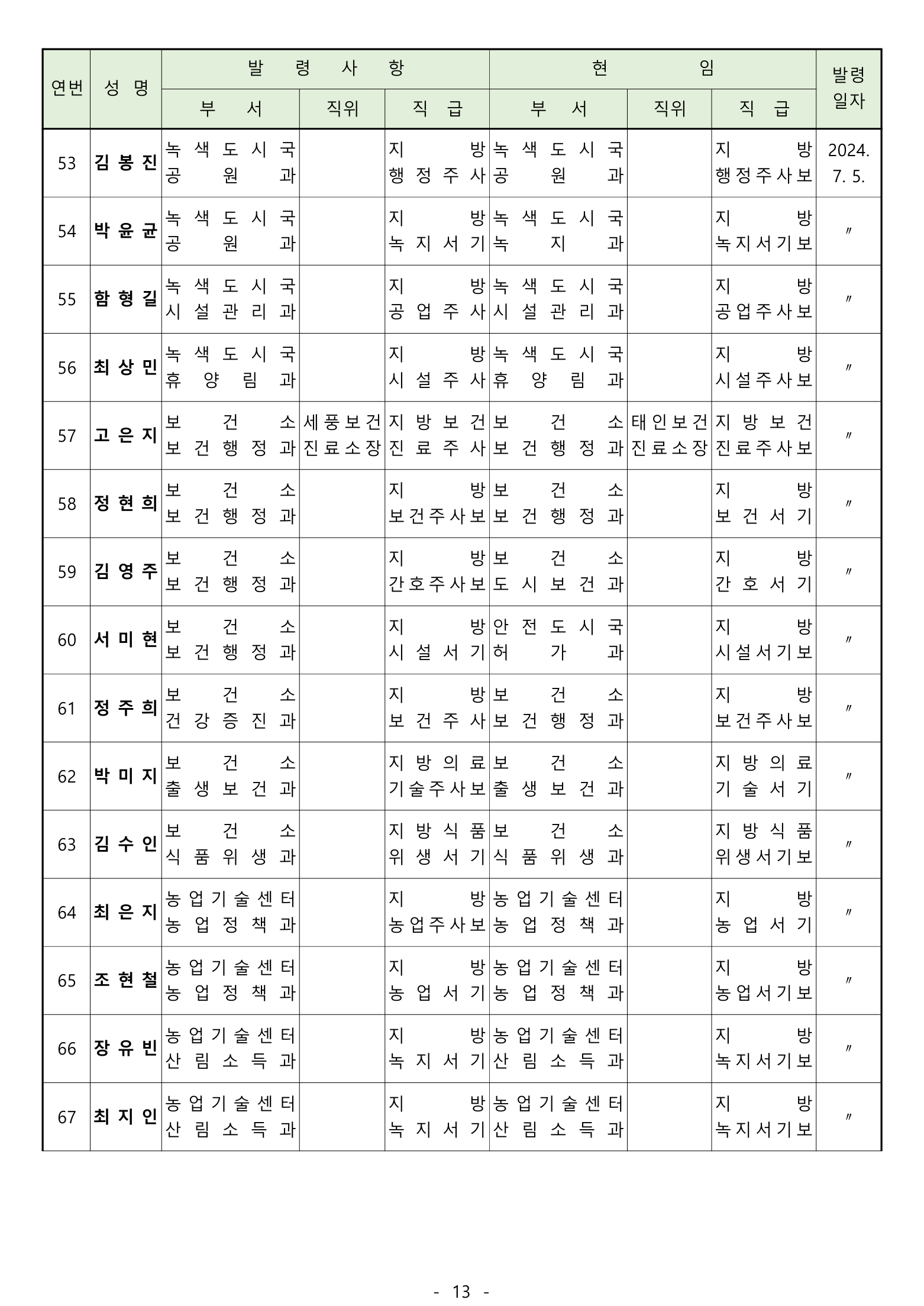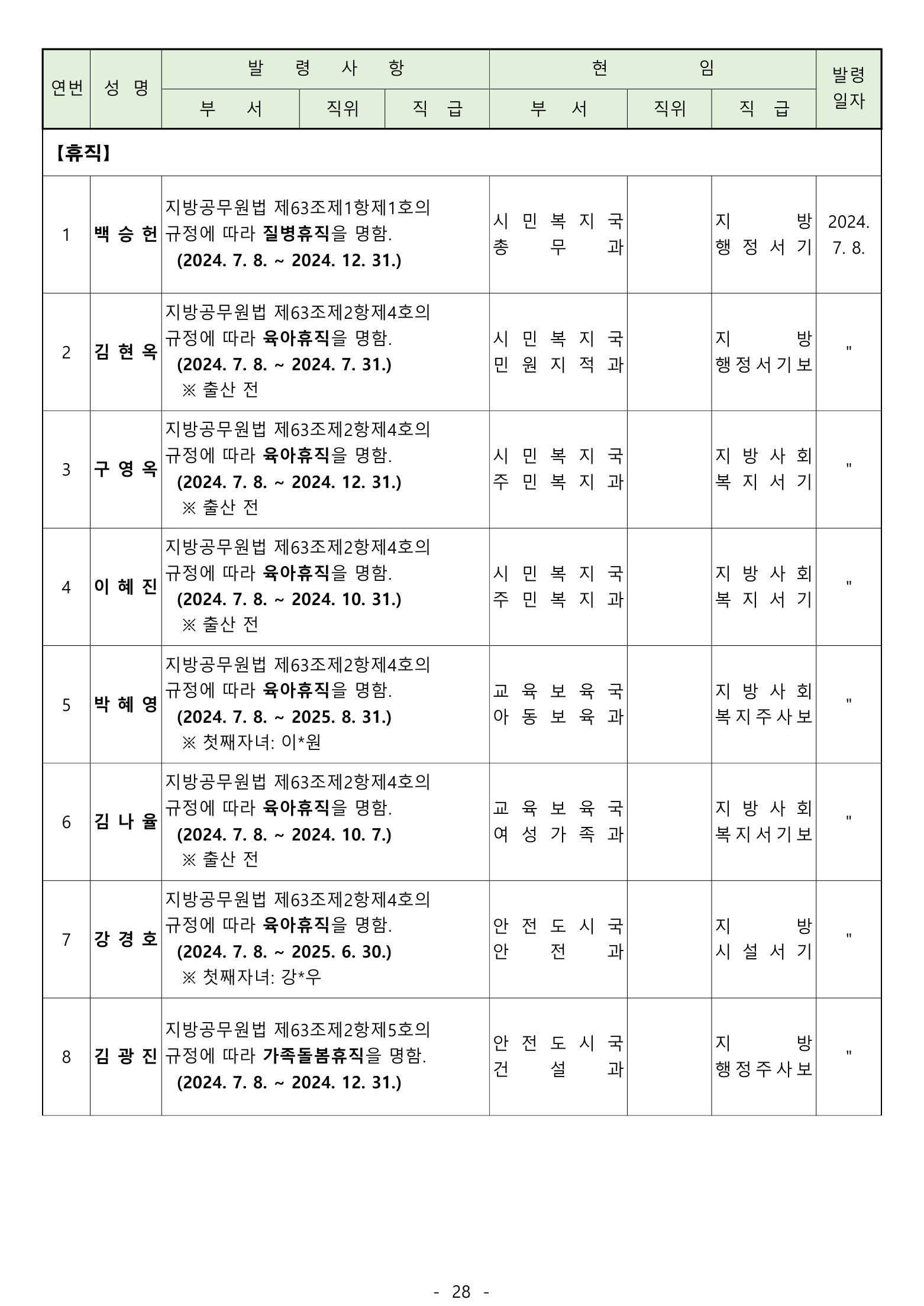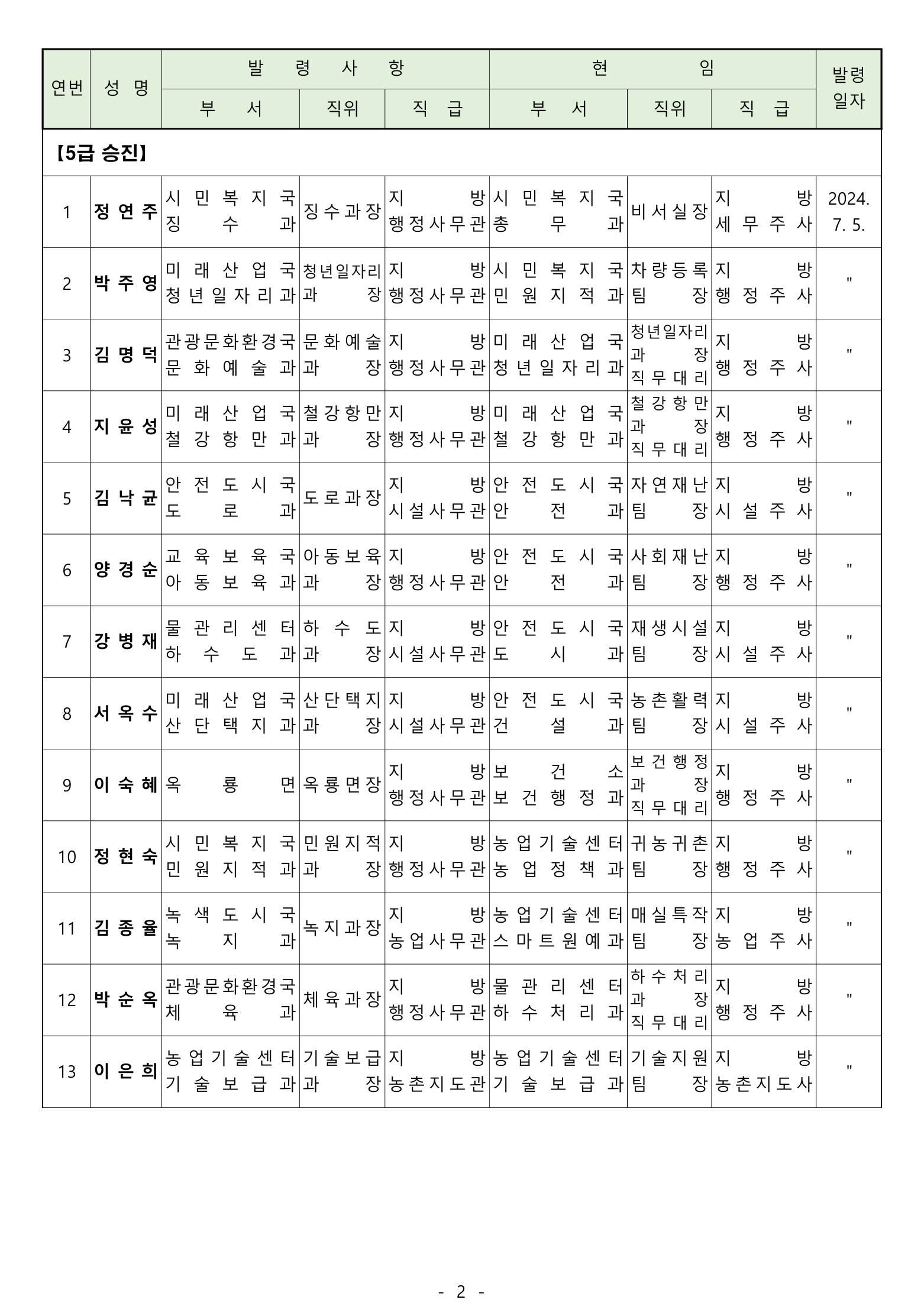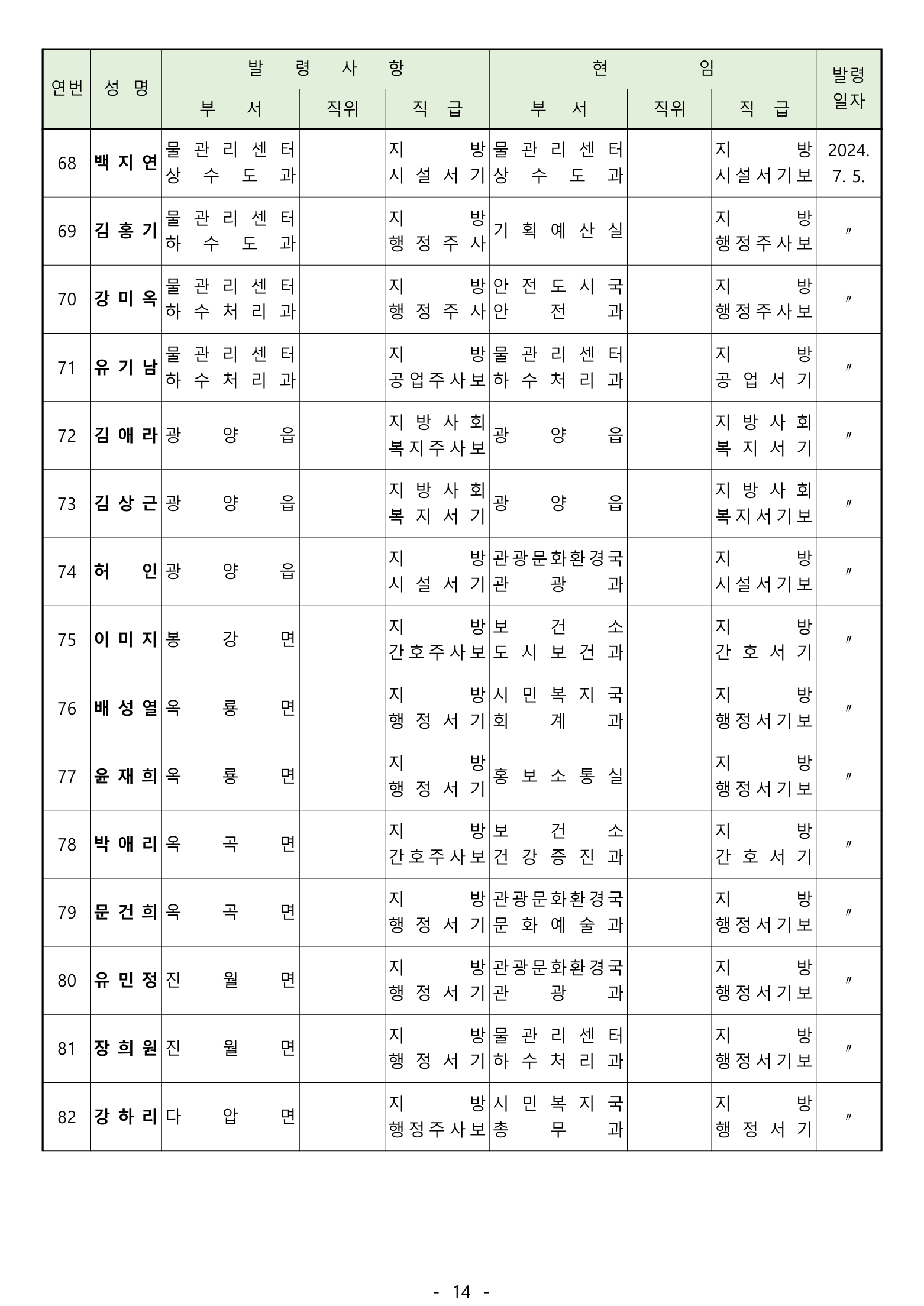 ‘ 전입 2며. 공로연수 14명, 휴직 13명, 복직 5명, 작무파견 1명, 의원면직 1명
