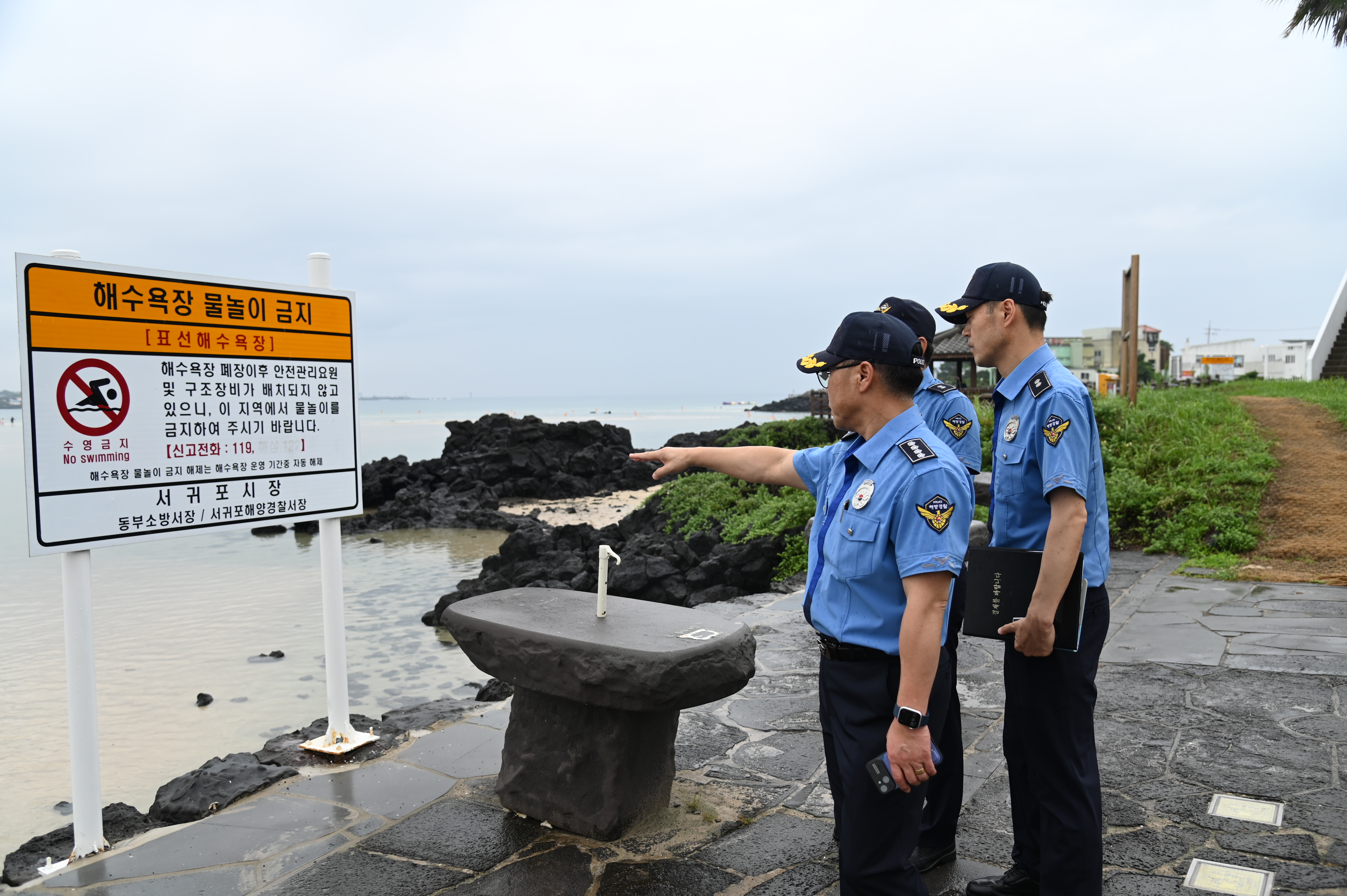 서귀포해양경찰서(서장 고성림)는 오늘 (11일) 집중호우 및 태풍내습을 대비하여 지휘관 주관으로 취약 항포구와 관내 해수욕장 및 물놀이 구역 등 연안해역 긴급 안전점검을 실시하였다.