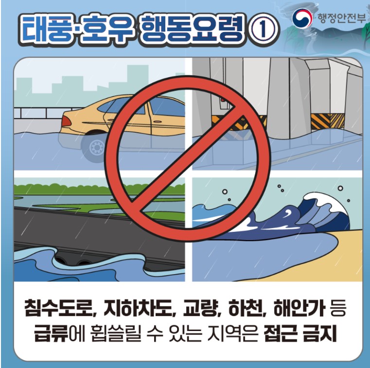 태풍·집중호우 대비 행동요령은 △상습 침수지역·산사태 위험지역은 피하고 안전한 곳으로 대피 △문과 창문 닫고 외출 자제 △기상상황 수시 확인 △하천변 등 침수 위험지역 접근 금지 등이다.