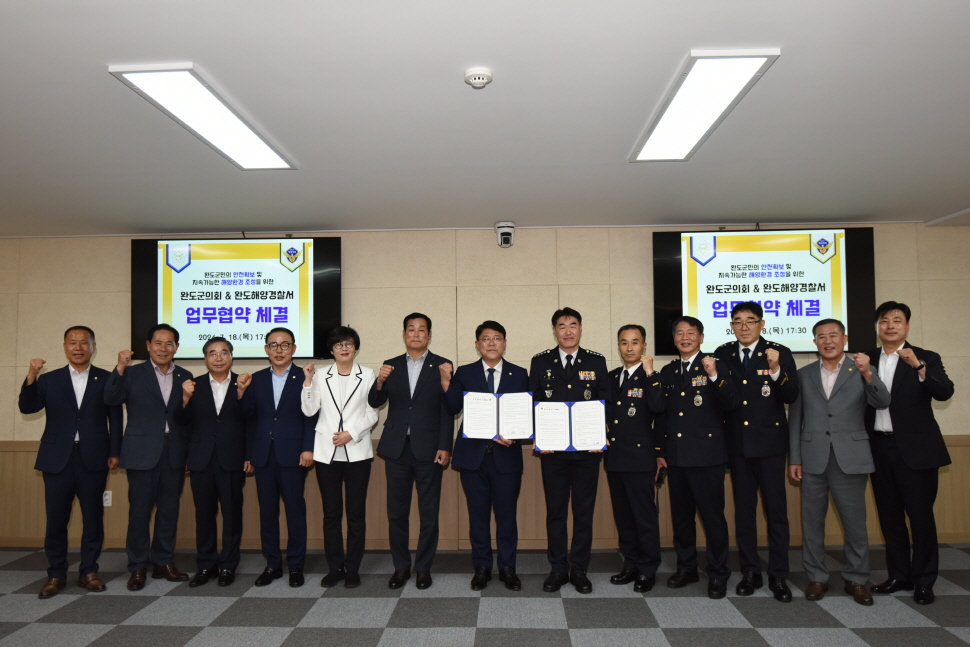 완도해양경찰서(서장 이영호)는 지난 18일 각종 해양안전사고 예방 및 수산자원 보호와 지역사회 발전을 도모하고자 완도군의회와 업무협약을 체결했다고 밝혔다.