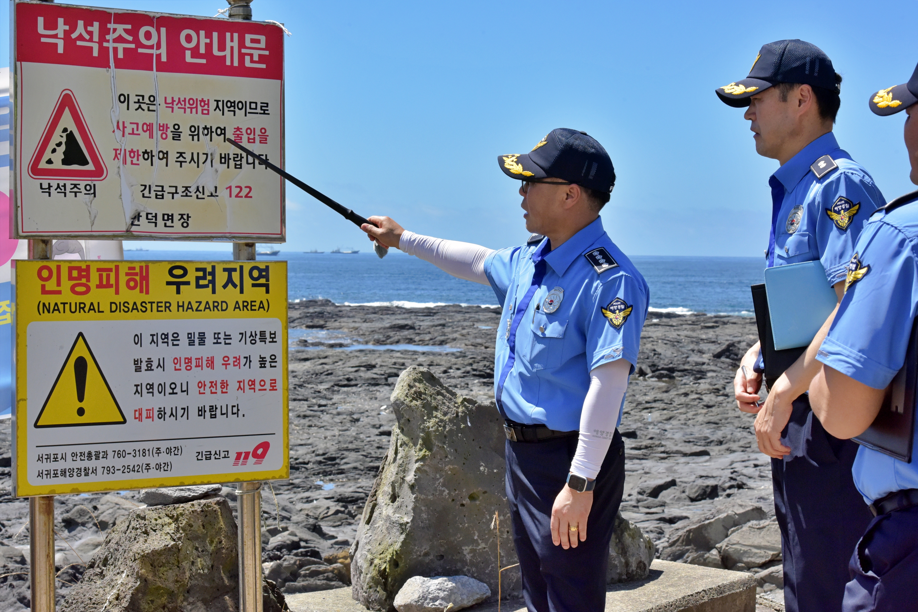서귀포는 해수욕장을 비롯해 바다 근처 물놀이 명소가 많아 물놀이 구역의 위험성을 확인하고 비상 시 사용할 수 있는 인명구조함 등 안전관리시설물의 관리상태를 점검하였다.