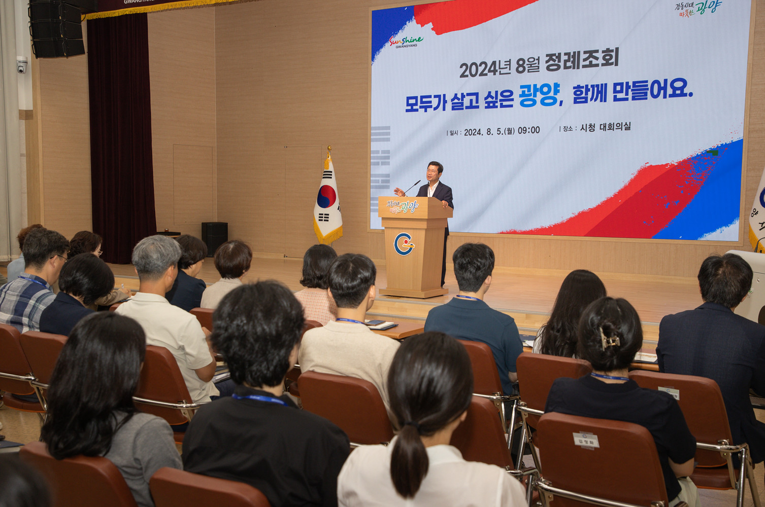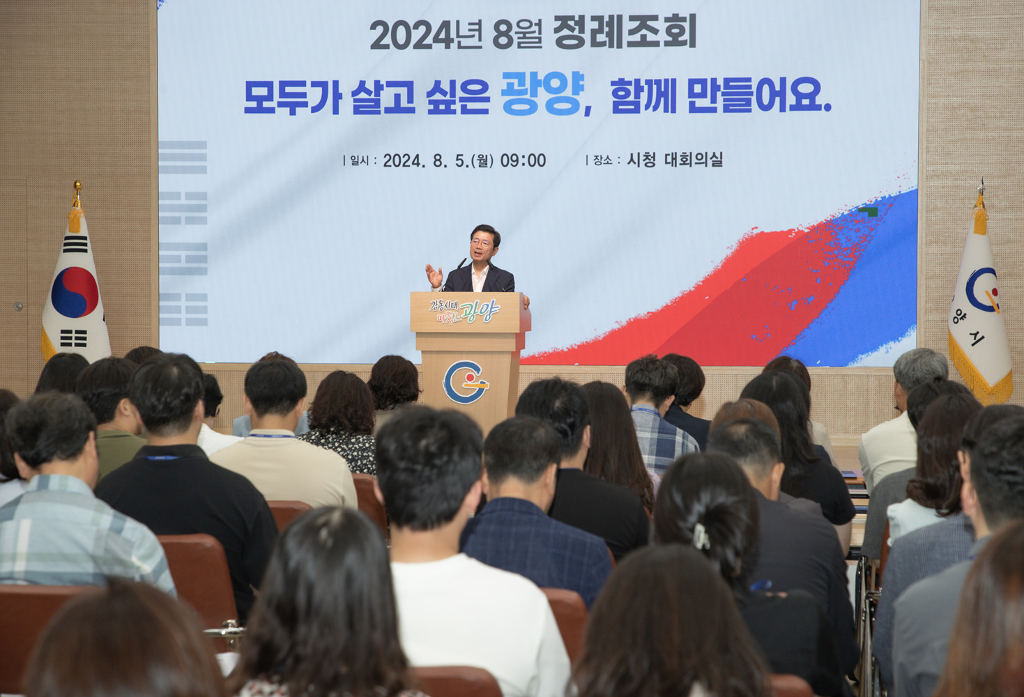 광양시(시장 정인화)는 오늘(5일) 시청 대회의실에서 공직자 150여 명이 참석한 가운데 2024년 8월 정례 조회를 개최했다.