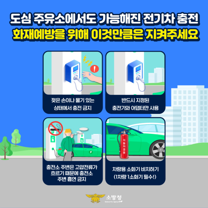 이에 소방서는 전기차 충전시설 화재 예방을 위한 안전수칙으로 ▲젖은 손이나 물기가 있는 상태에서 충전시설 사용 금지 ▲지정된 충전기 및 어댑터 사용 ▲충전소 주변 흡연 금지(고압 전류에 따른 화재 우려) ▲주변 가연물 제거 ▲충전 완료 후 플러그 제거 ▲충전시설 인근 소화기 및 질식소화포비치 등이 있다.